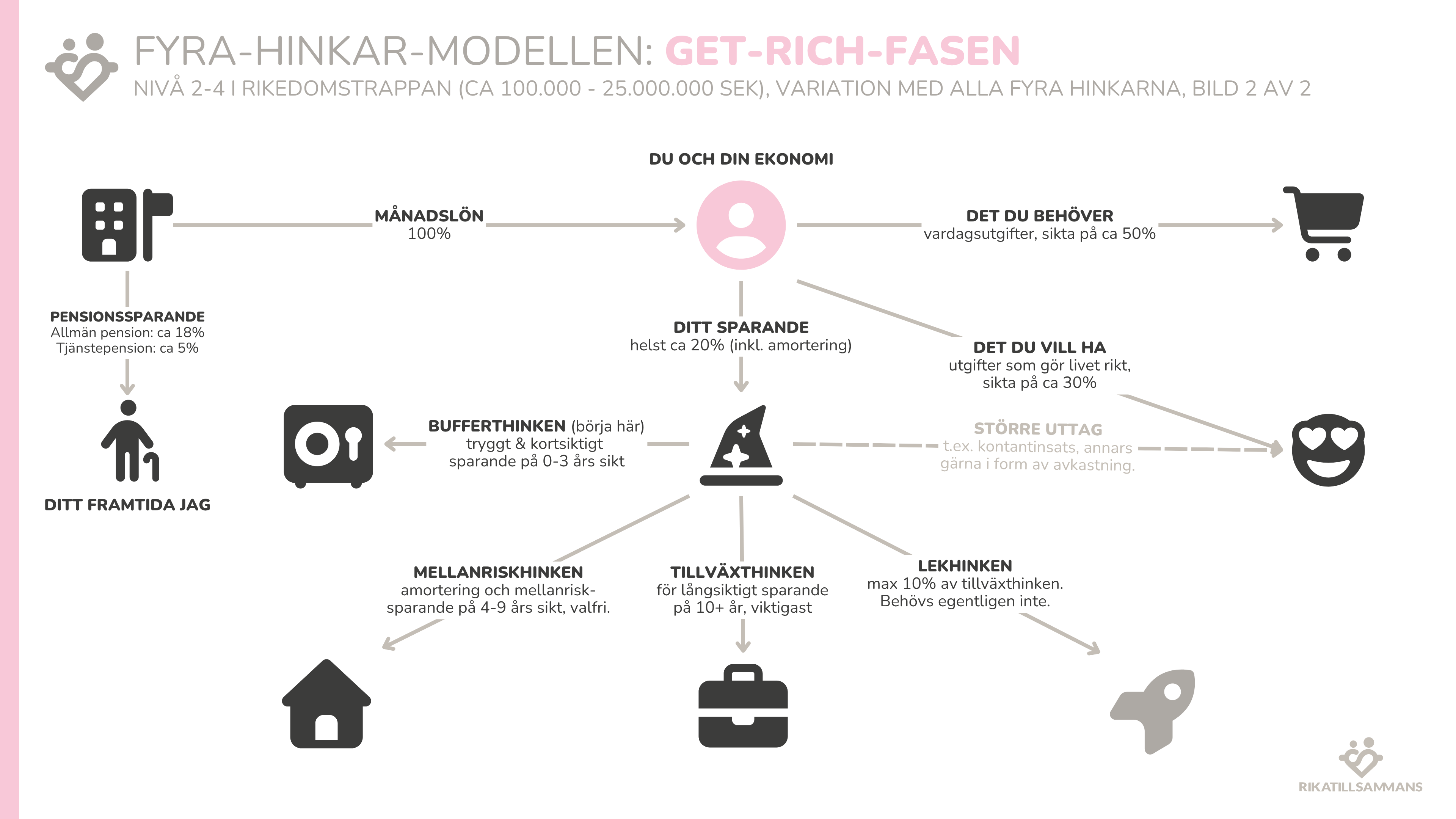 Fyra-hinkar-principen är en modell för att strukturera sin ekonomi, få rätt balans i sparandet och kanske även få en bättre totalavkastning. Det är även en modell du kan anpassa till din egen situation beroende på var du är på Rikedomstrappan.
