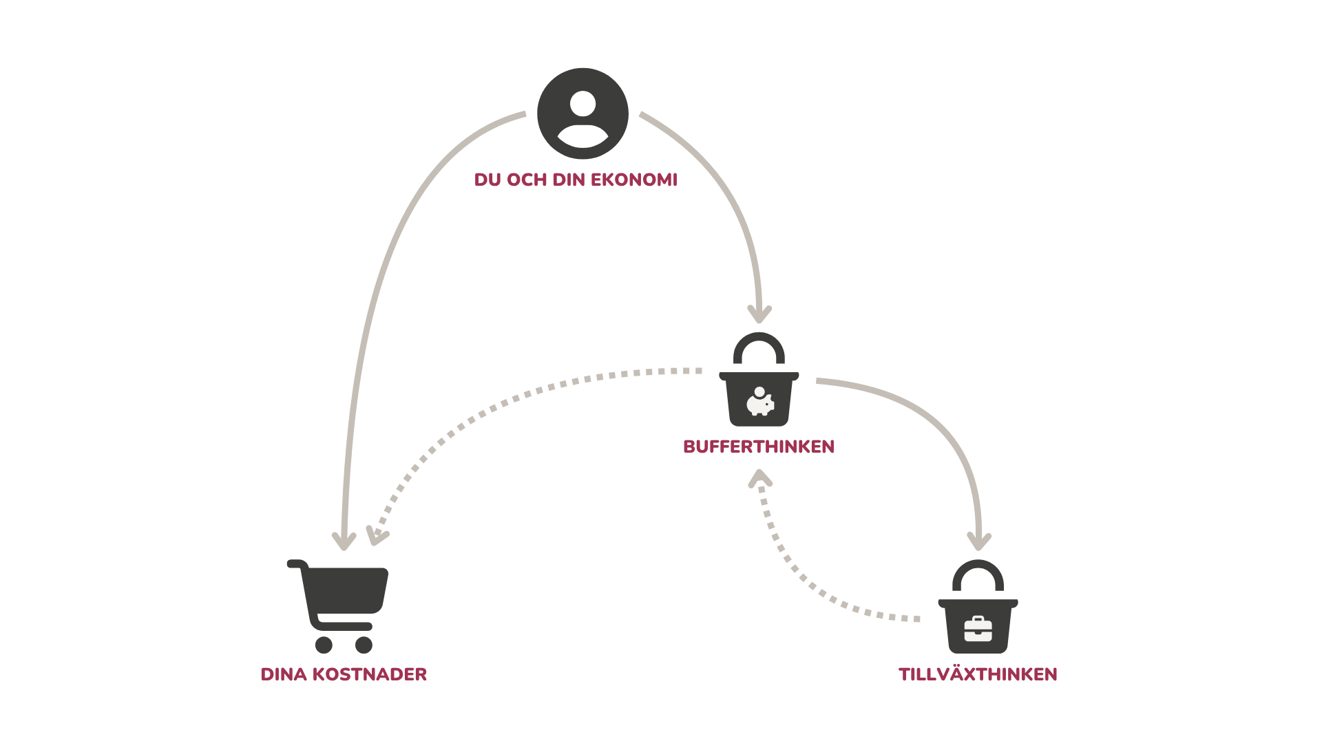 I min värld har buffert och mellanhink till syftet att skydda tillväxthinken från tömning och kan offras under långvariga krascher för att bevara tillväxthinken. Boendet är en tillgång men inget man rimligtvis säljer av (om man inte planerat för det) för att bekosta sina utgifter, därför tycker jag att boendet inte har där att göra utan bör flyttas till tillväxthinken (då det oftast blir ett arv) eller tas bort ur ekvationen.