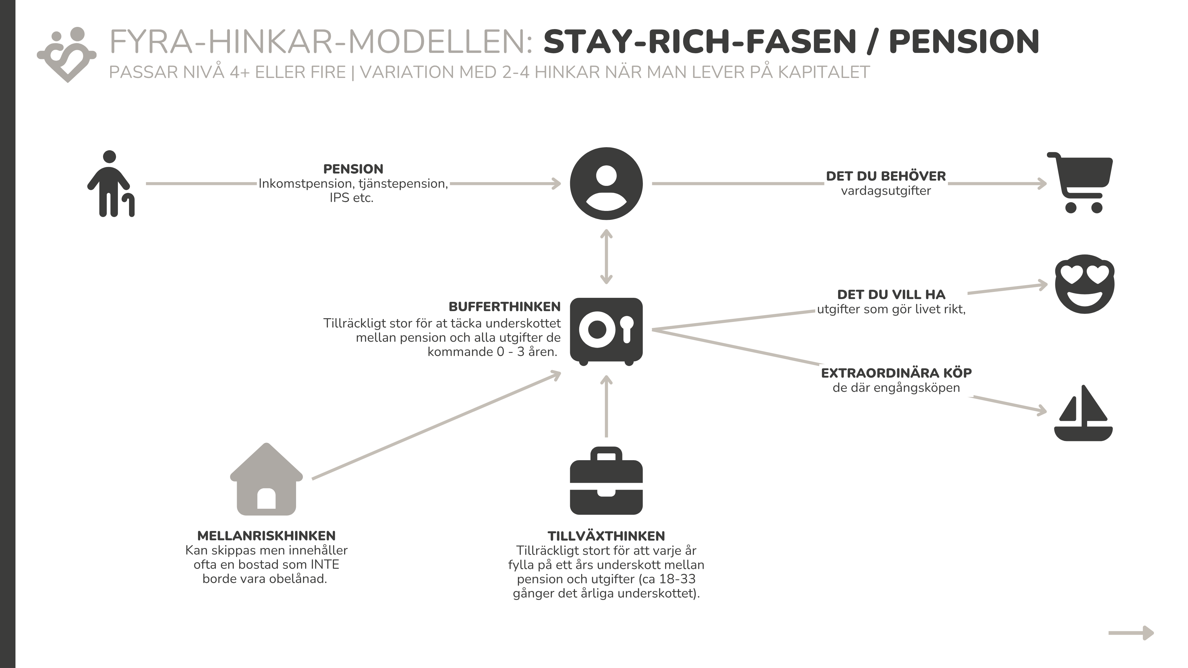 Pensionsportföljerna behöver också ses över inför stay rich så de inte ligger med varken för hög eller låg risk, samt att man behöver en uttagsstrategi, vilket ordning man tar ut dem i. De får då olika sparhorisont och kan därför behöva olika risk/portföljer. Något att se över i 55+ års ålder. Kanske detta också kan framgå schematiskt i bildspelet med en liten text för det behöver väl knytas till en ”allt om pensioner” sida