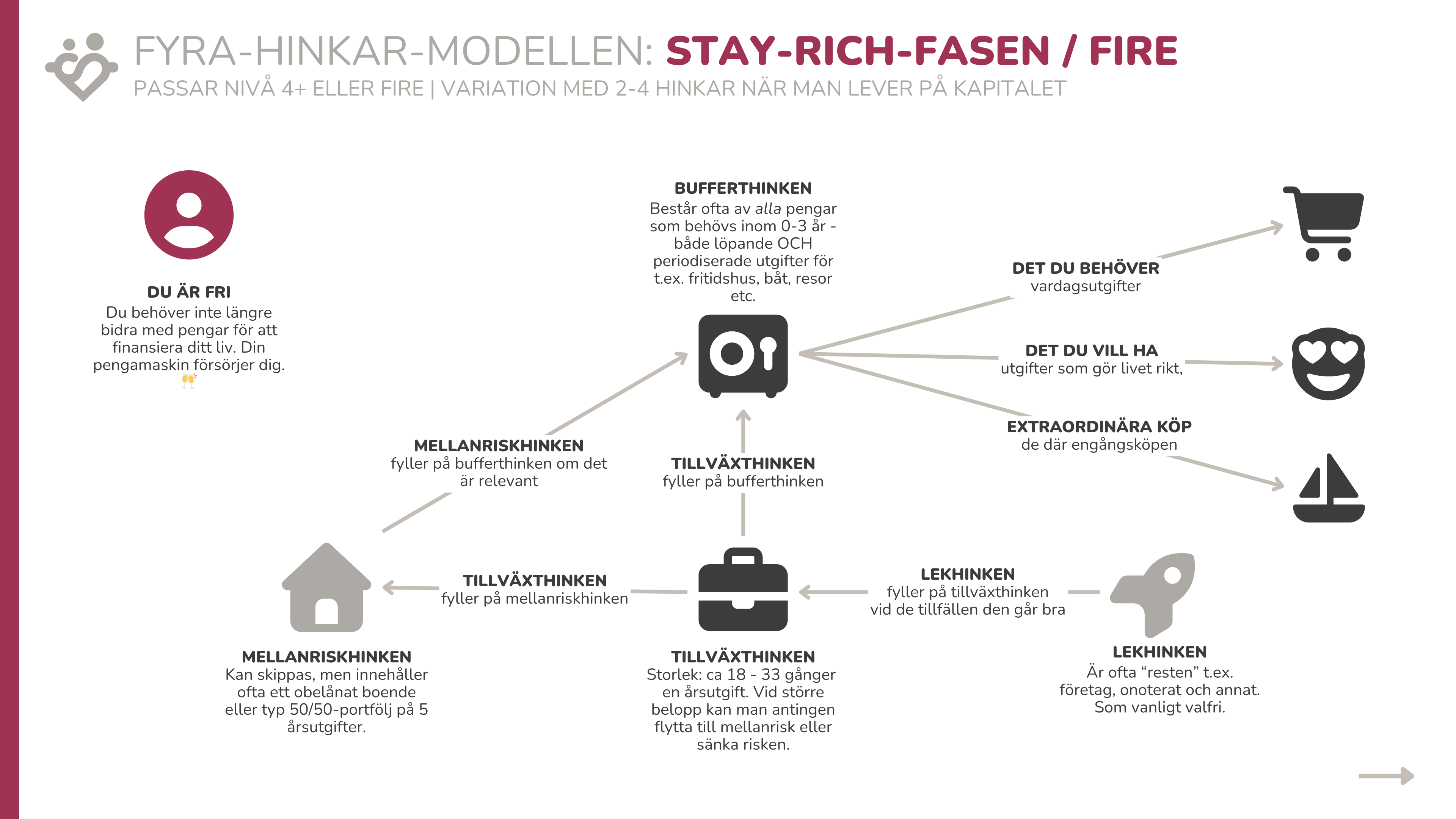 Lite konfunderat att huvudportföljen mest ser ut att fortsatt vara tillväxtportföljen, mer som en ”get even richer” fas Stay rich portföljen är ju egentligen upp till 5 årsbehov i buffert/säkert och minst 25 årsbehov i 50/50 vilket ju klassas som MR hink. Jag tänker att stay rich portföljen kanske borde vara default i stay rich fasen. Sen kan man beroende på kapital, riskprofil, behov av avkastningnivå eller för att lämna arv kan köra tillväxt portföljen helt eller delvis istället för MR / Stay rich portfölj men att det nog ska vara ett genomtänkt beslut, inte default. IMO