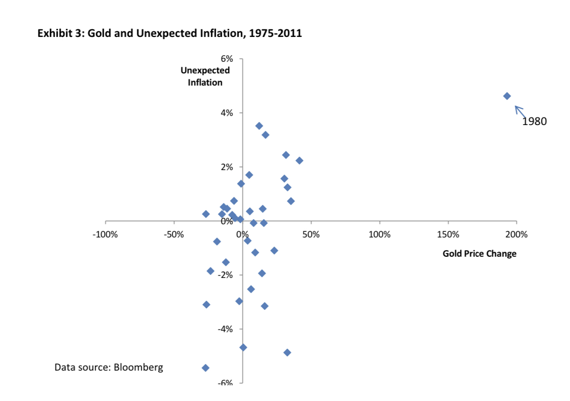 Behöver nödvändigtvis inte vara sant, beroende på vilka tidsperioder du tittar på. Finns 30 års perioder då guld visat sig vara en mycket dålig inflationshedge, och särskilt dåligt mot oväntad inflation: