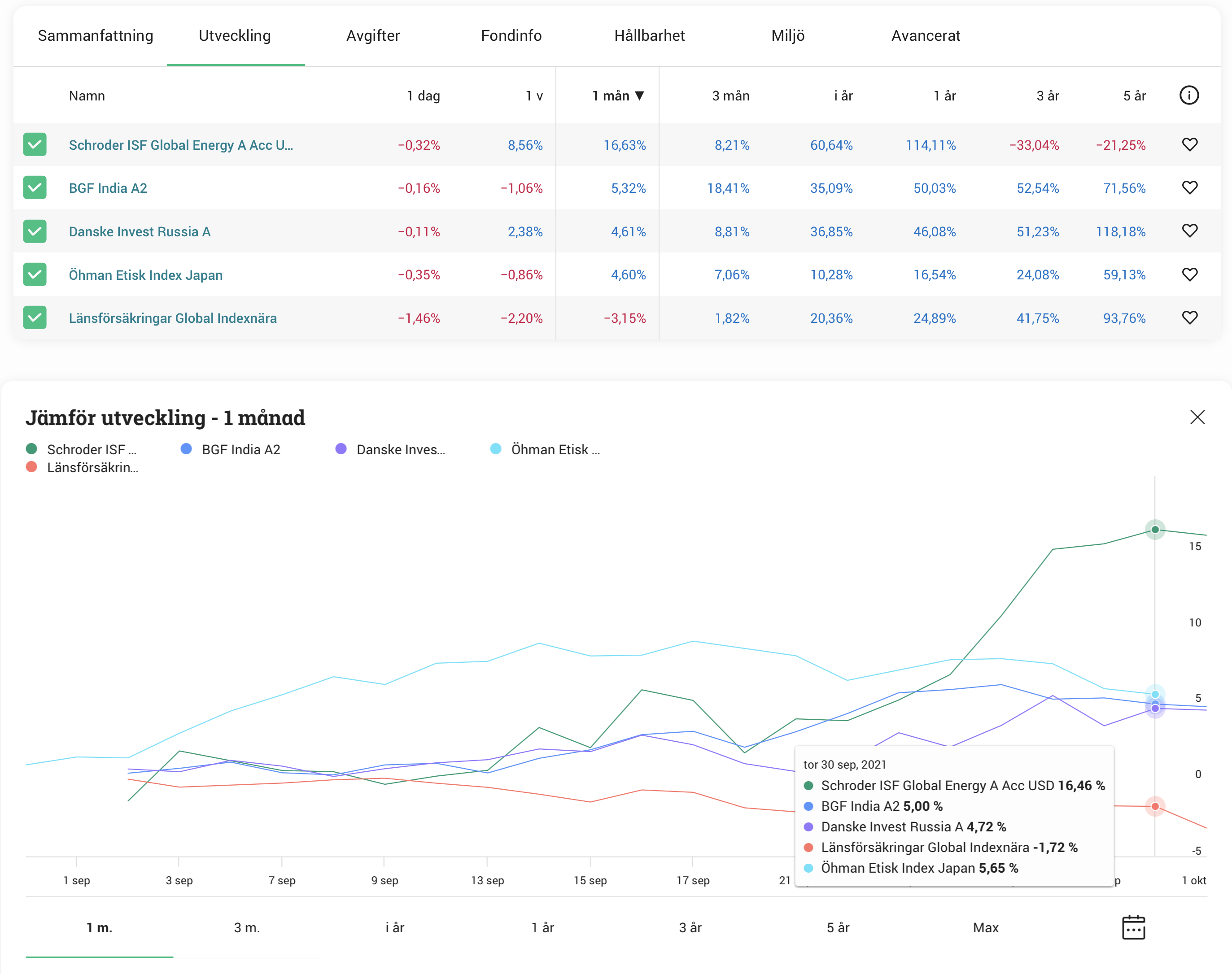 Schroder ISF Global Energy ser intressant ut men här kommer lite hantverket in. Den typen av fonder är vassa periodvis men skiftar väldigt snabbt ner med samma fart. Sådana undviker jag om jag hittar andra rimliga alternativ.