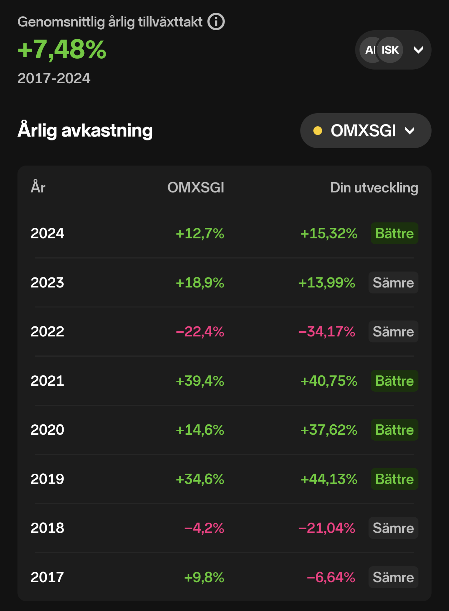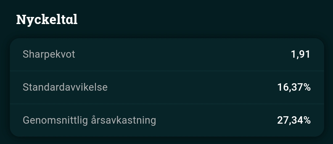 Är klart nöjd med det. Jag har fegat ibland och bytte till ex peningmarknadsfonder eller obligationer till viss del när jag trodde att nedgång skulle komma. Funkade ibland