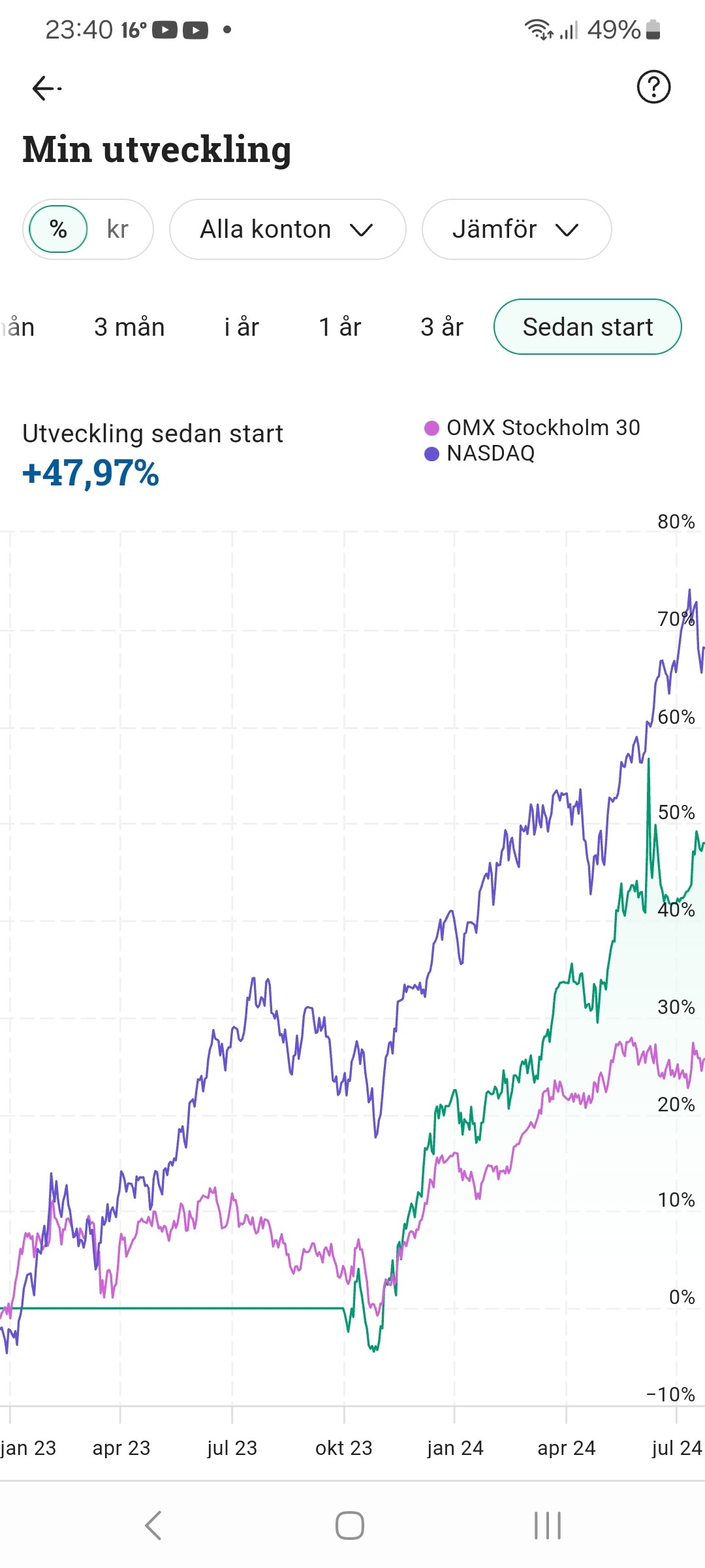 Har lekhinken på Nordnet. De två första åren (2017-2018) trodde jag att jag själv kunde välja ut bra bolag, haha, katastrofalt illa. Därefter har jag enbart haft investmentbolag vilket gått bättre ![]()
