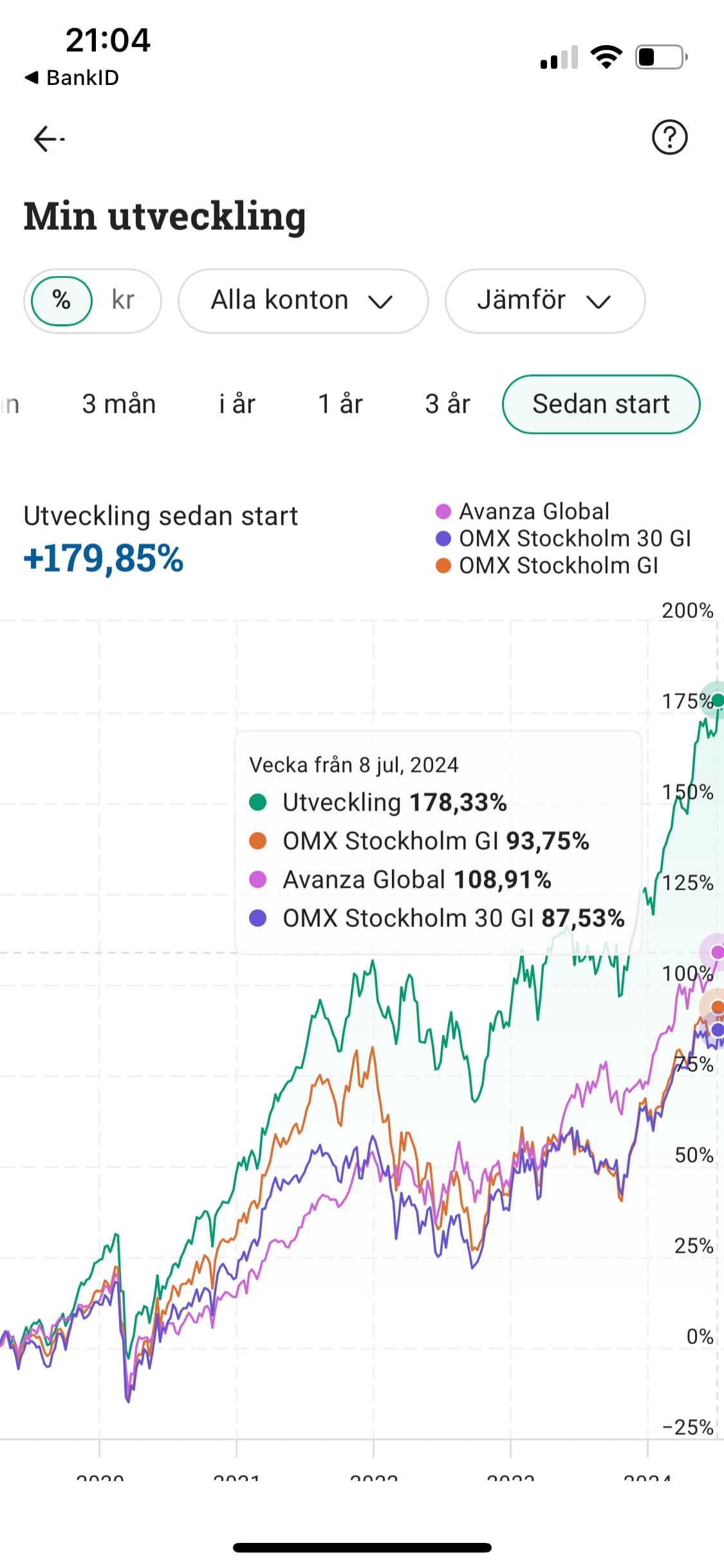 12,8% i snitt och 280% sedan jag började spara på Avanza 2017.