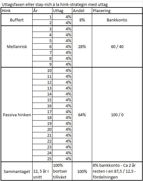 Med detta resonnemag borde Torbjörns fördelning ligga konstant 75 - 25 i hans bild i uttagsfasen, om inte barnens boendeinsatser förflyttar beloppen mellan hinkarna. Torbjörn du skulle kunna göra en enkel analys som bilden nedan och se var du hamnar i tidshorisont.