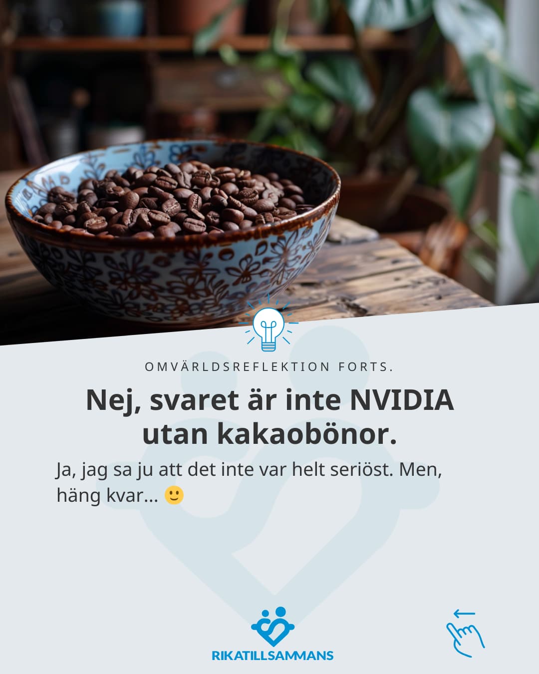 Yes, rätt svar är kakaobönan. Den har de senaste 6 månaderna har varit i princip samma trade som NVIDIA, fast bättre.