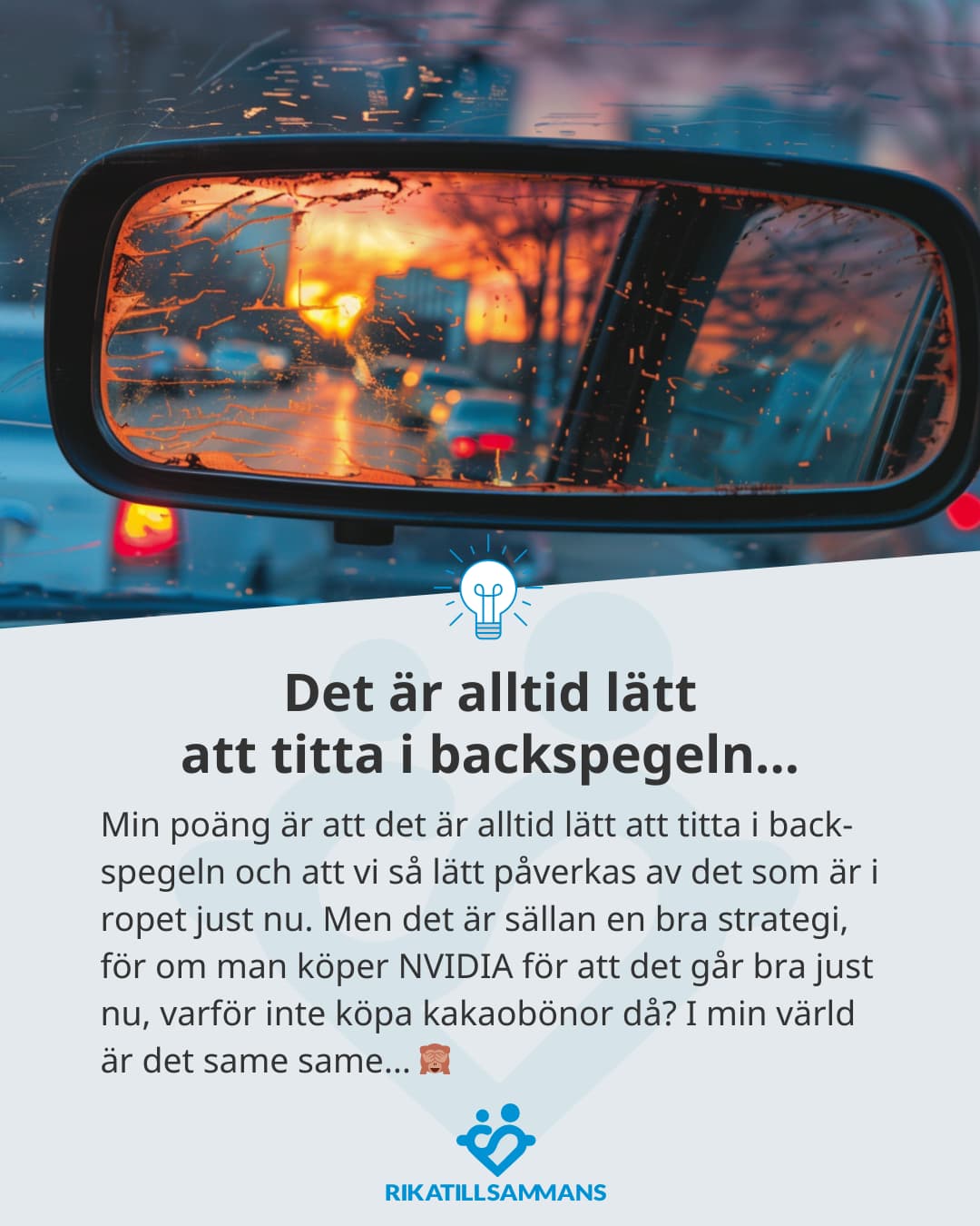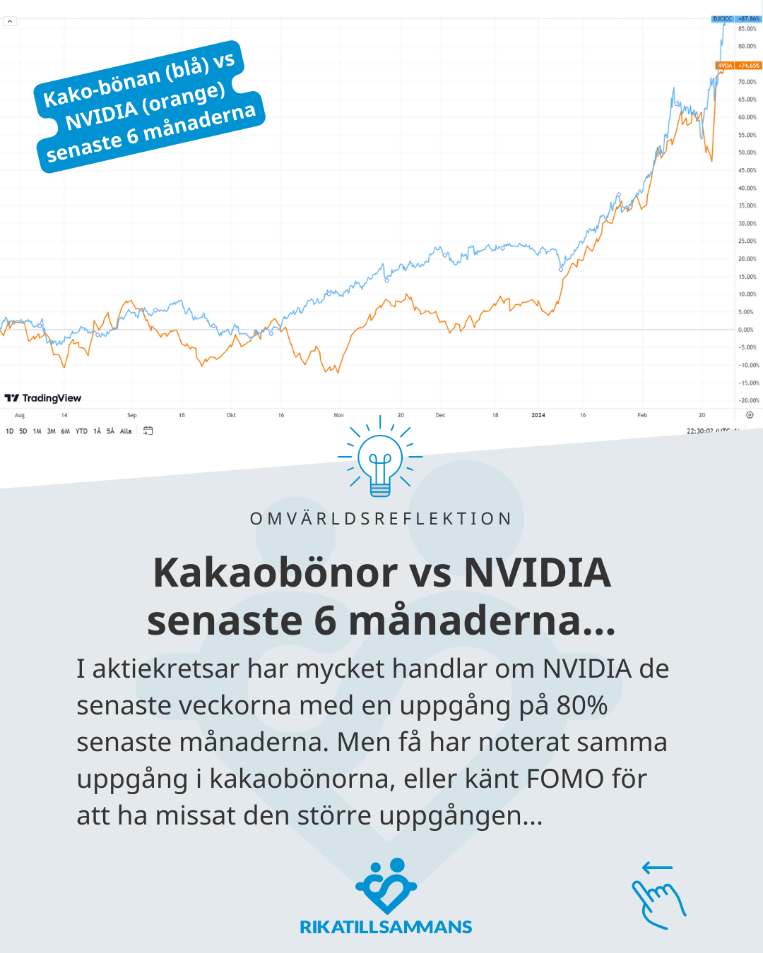 Det är inget nytt under solen med stora uppgångar på kort tid. Det har skett massor av gånger historiskt och lika många gånger har det vänt efteråt. Jag har ingen aning om det kommer göra så med kakao eller NVIDIA, men däremot tänker jag att man inte behöver jaga uppgång eller känna FOMO för att ha missat den.