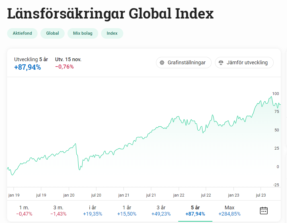 De som ägt globala indexfonder senaste 5 åren är upp ungeför 90%, alltså 18% per år: