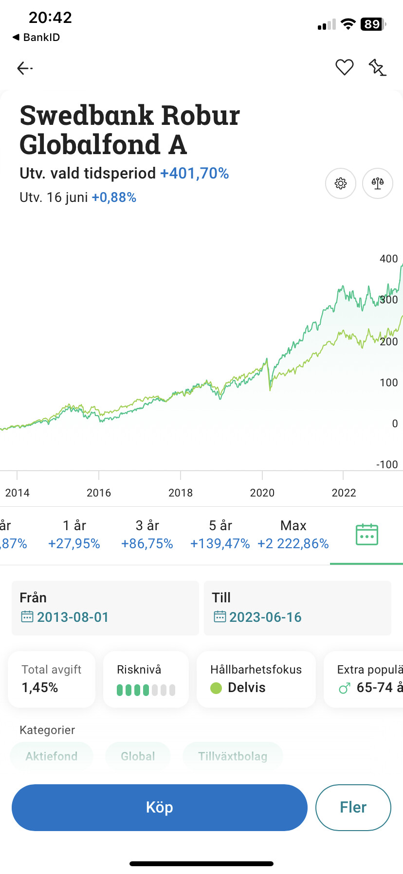 Jag börjar lyfta över medel i en global indexfond och eftersom jag har det mesta i Swedbank så tänkte jag att Robur Access global vore en lämplig sådan (LF globala indexfond finns dessutom inte i utbudet). Men så ser jag att Robur Globalfond A har haft en mycket bättre utveckling trots sin högre avgift. Under i stort sett vilken period jag än väljer. På fem år skiljer hela 61 procentenheter.