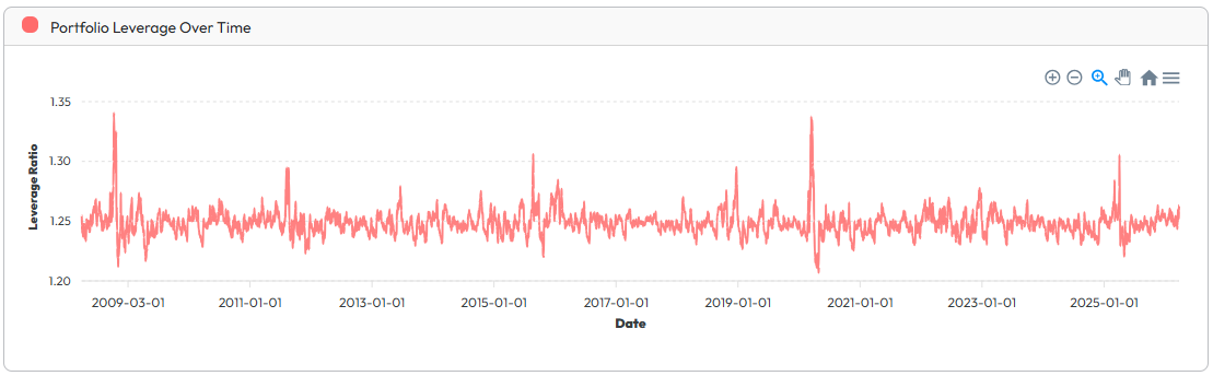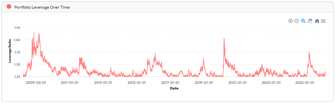 *Dynamisk hävstång innebär att hävstången alltid hålls på minst 1.25x men att den tillåts stiga obegränsat när börsen går ner, vilket innebär att man har som högst hävstång när det sedan vänder uppåt igen (under denna period max 1.43x, se graf nedan). En strategi som man kan sköta själv via VP-belåning och som har diskuterats (och rekommenderats) i Jakten på den “ultimata” allvädersportföljen