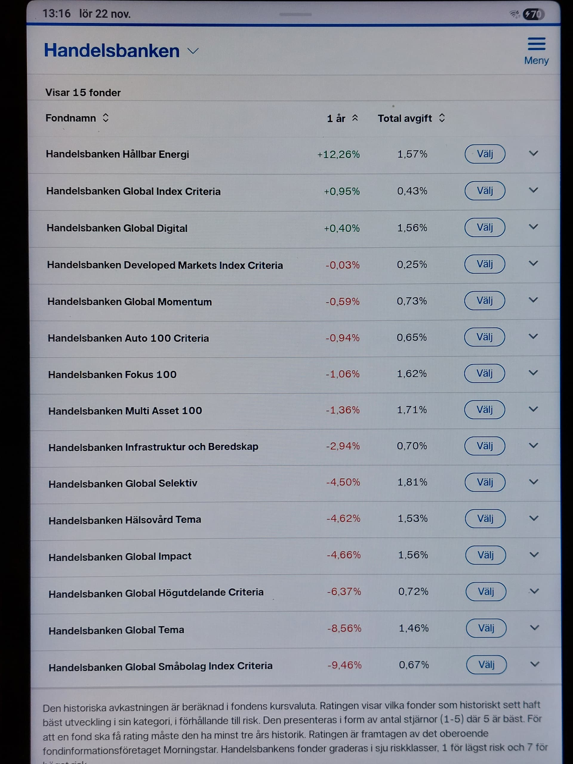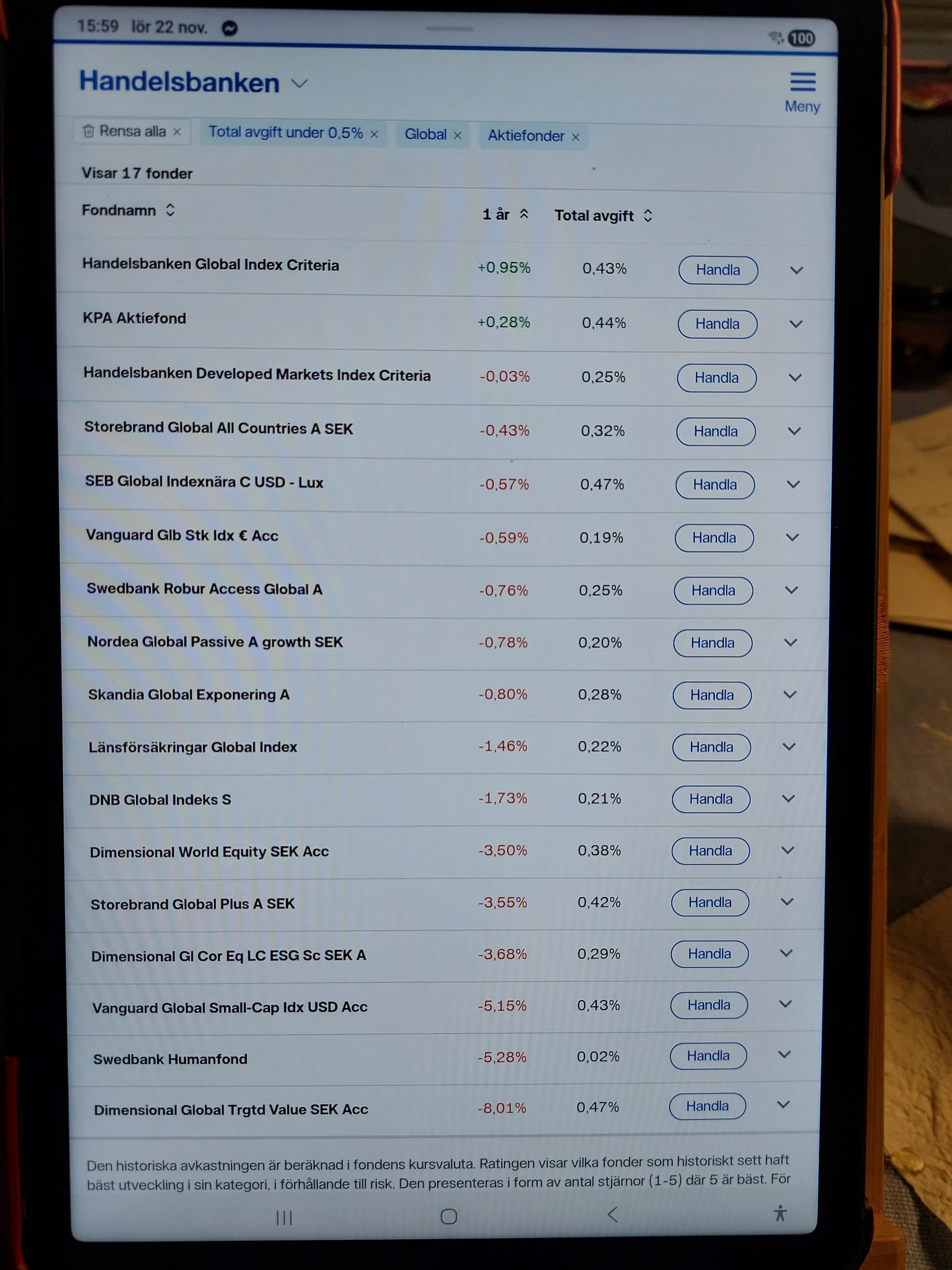 Lutar åt att successivt byta över till billigare index fond. Känner inte att den högre avgiften för Handelsbanken motiverar även om den har mer hållbarhetstänk. Tänker mer på avkastningen i långa loppet.