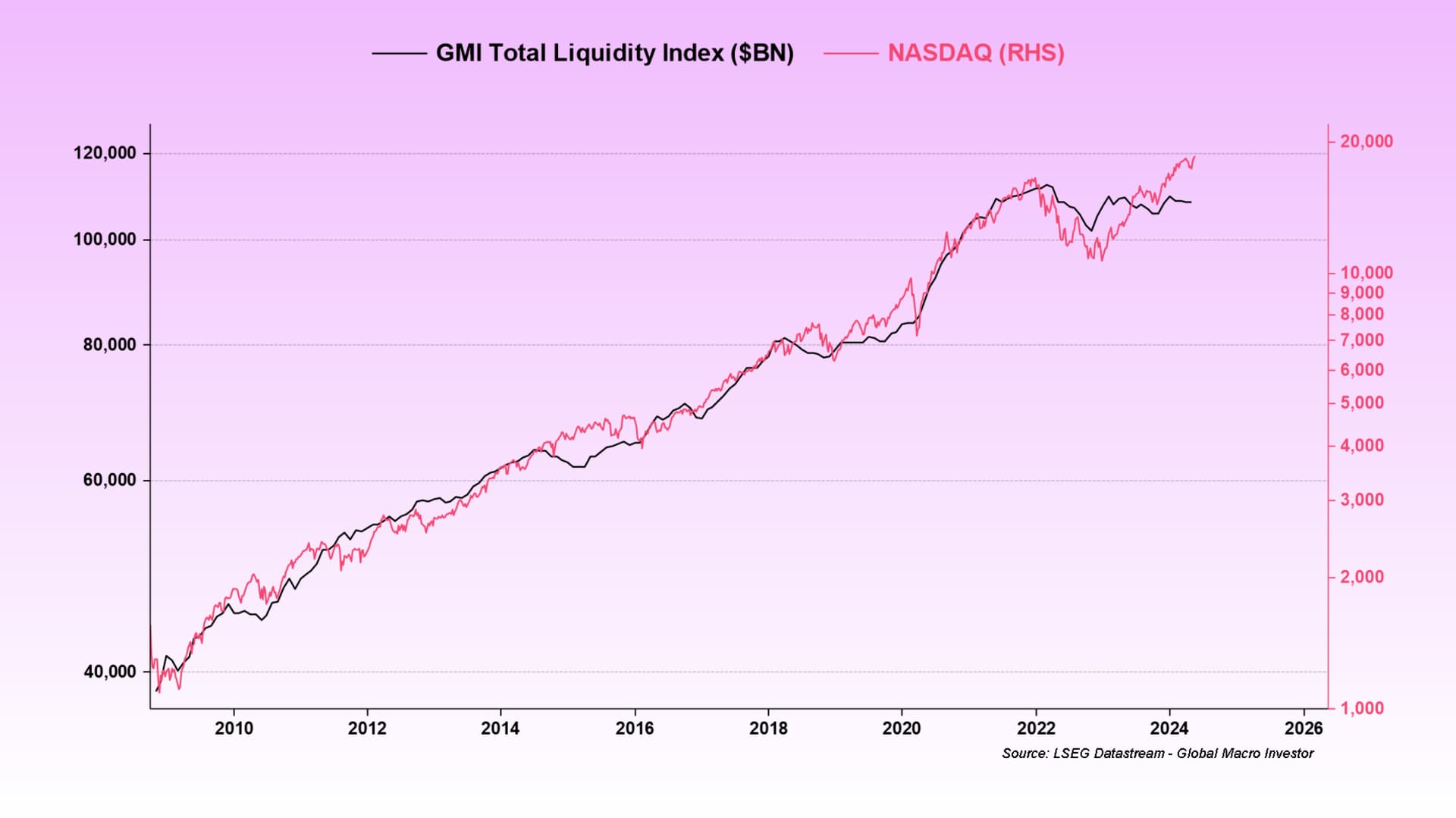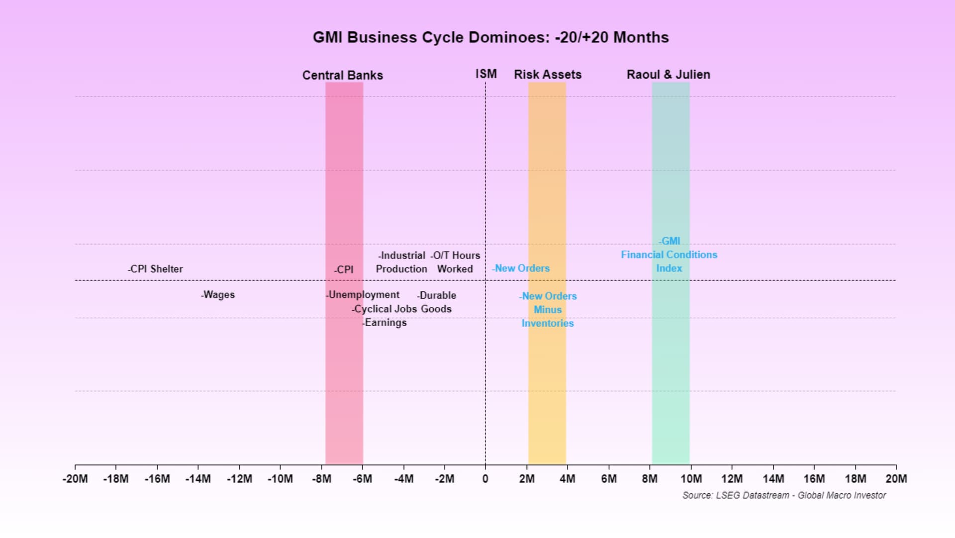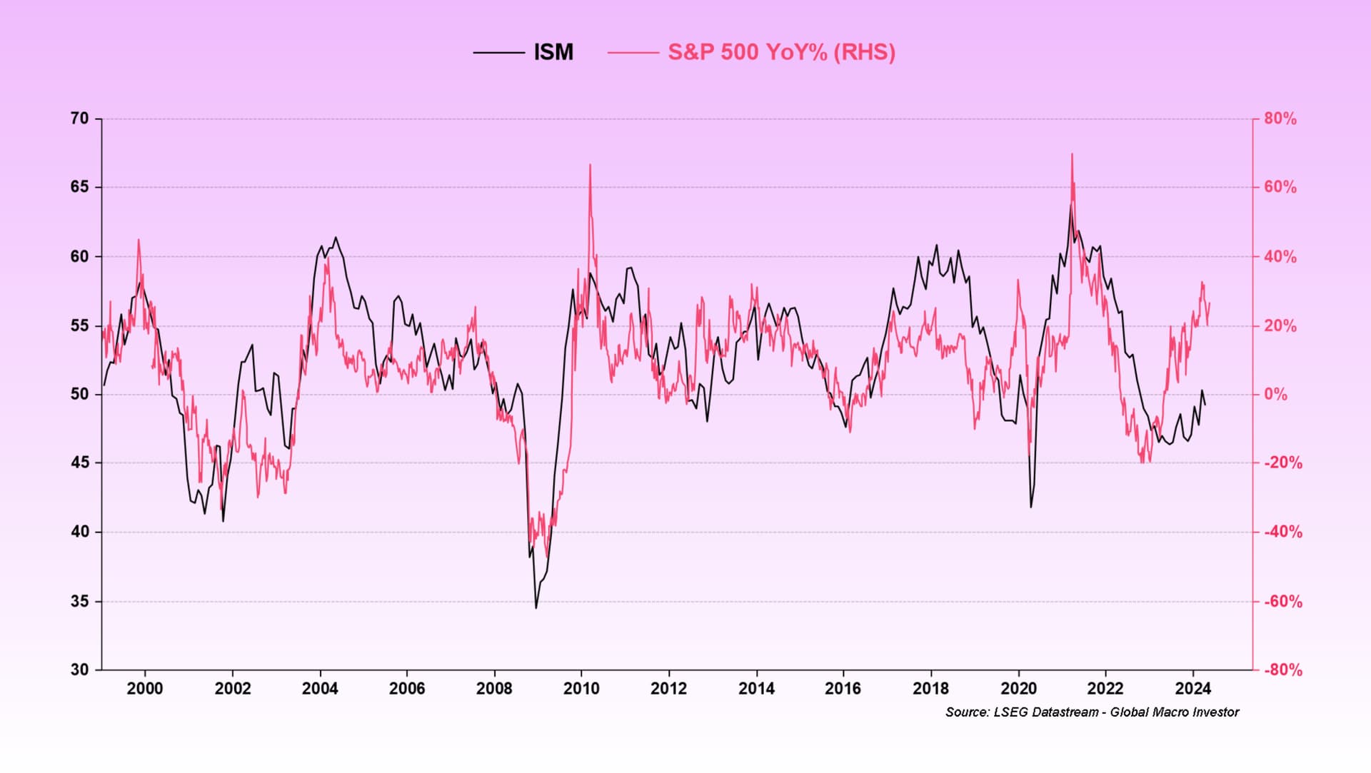 Sedan 2008 följer marknaden mer eller mindre ISM – där olika sektorer/tillgångar ligger före (teknik/hög risk, som Nasdaq 100, vissa ligger närmare ISM (Russel 2000) och andra indikatorer laggar efter (data kring vinst, KPI, arbetslöshet, löner)