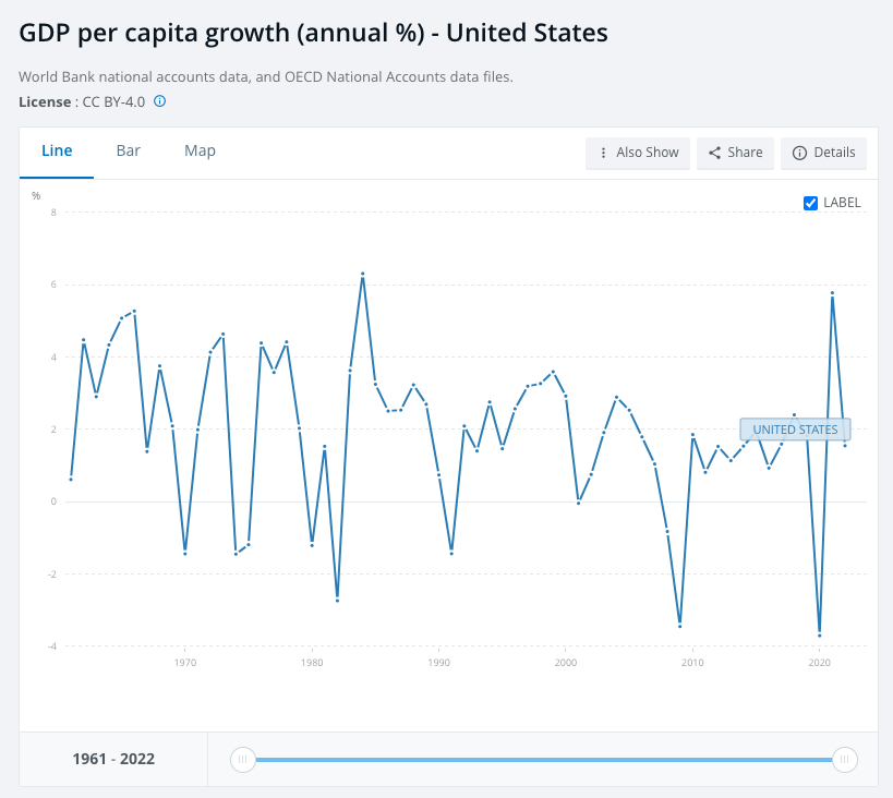 Ja, att ökning i BNP/Capita trendar nedåt är väntat. I USA införs mer regleringar och beskattning/omfördelning, och det hämmar tillväxt. (Samma i EU fast värre).