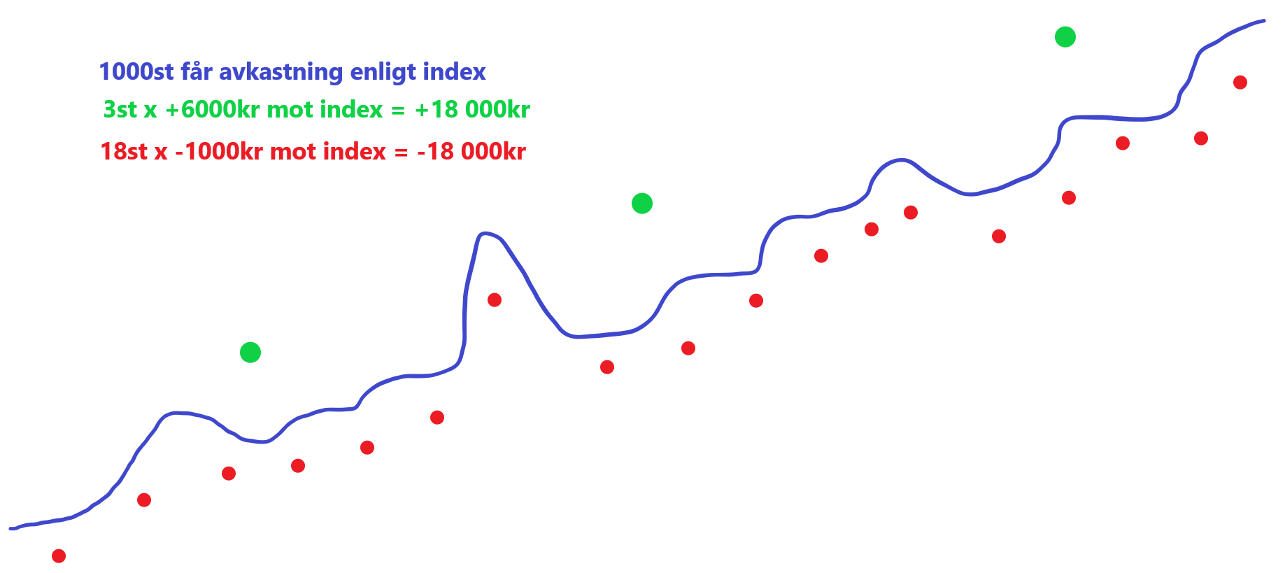 Tack för ditt svar. Måste fundera på detta och skillnaden mot att köpa sllalotterna. För då förlorar man fast man får alla vinsterna. Snittetär alltså inte summan an alla aktiers resultat under året ?! Det mesta rullar väl på och stjärnskott är väl inte så vanliga. Har det med köpeskillingen att göra? Funderar.