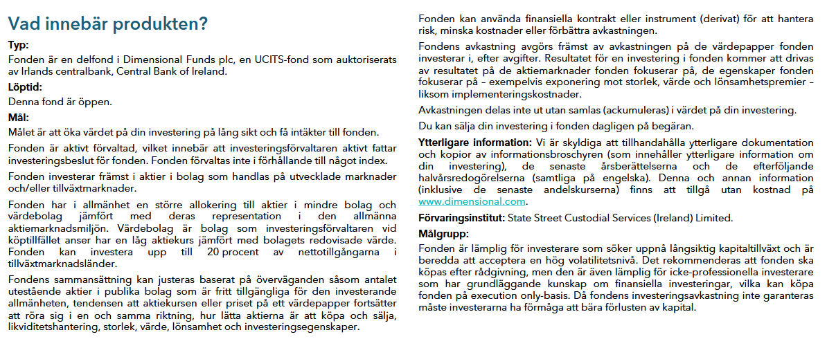 Det är värt att förstå att Dimensionals fonder varken är indexfonder eller passiva. De klassar sig själva som systematiskt aktiva i sin förvaltning och investerar evidensbaserat (forskning) genom att ta på sig flera riskfaktorer (såsom större vikt mot småbolag och värde, med flera) än bara marknadsrisken. Detta betyder att fonden kan överprestera eller underprestera sitt jämförelseindex under en viss tid.