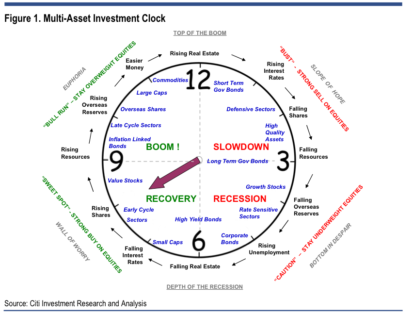 Om man tittar på Citis Mutli-Asset Investment Clock, som troligen är skapad då man fortfarande hade sjuttitalets stagflation i färskt minne, så ser man att korta räntepapper “Short Term Gov Bonds” har sin bästa tid mellan kl.12 och kl. 1. Sedan kommer det faser i börscykeln då räntorna stiger och det flesta andra tillgångsslag faller. Här ger det nog en viss tröst att sitta med korta räntepapper, men enligt dig så äts detta sedan upp av att jag får betala högre ränta på mitt portföljlån. Skulle jag då ha varit bättre gynnad av att inte ha några lån på portföljen? Eller att ta lån men inte alls investera i korta räntepapper?