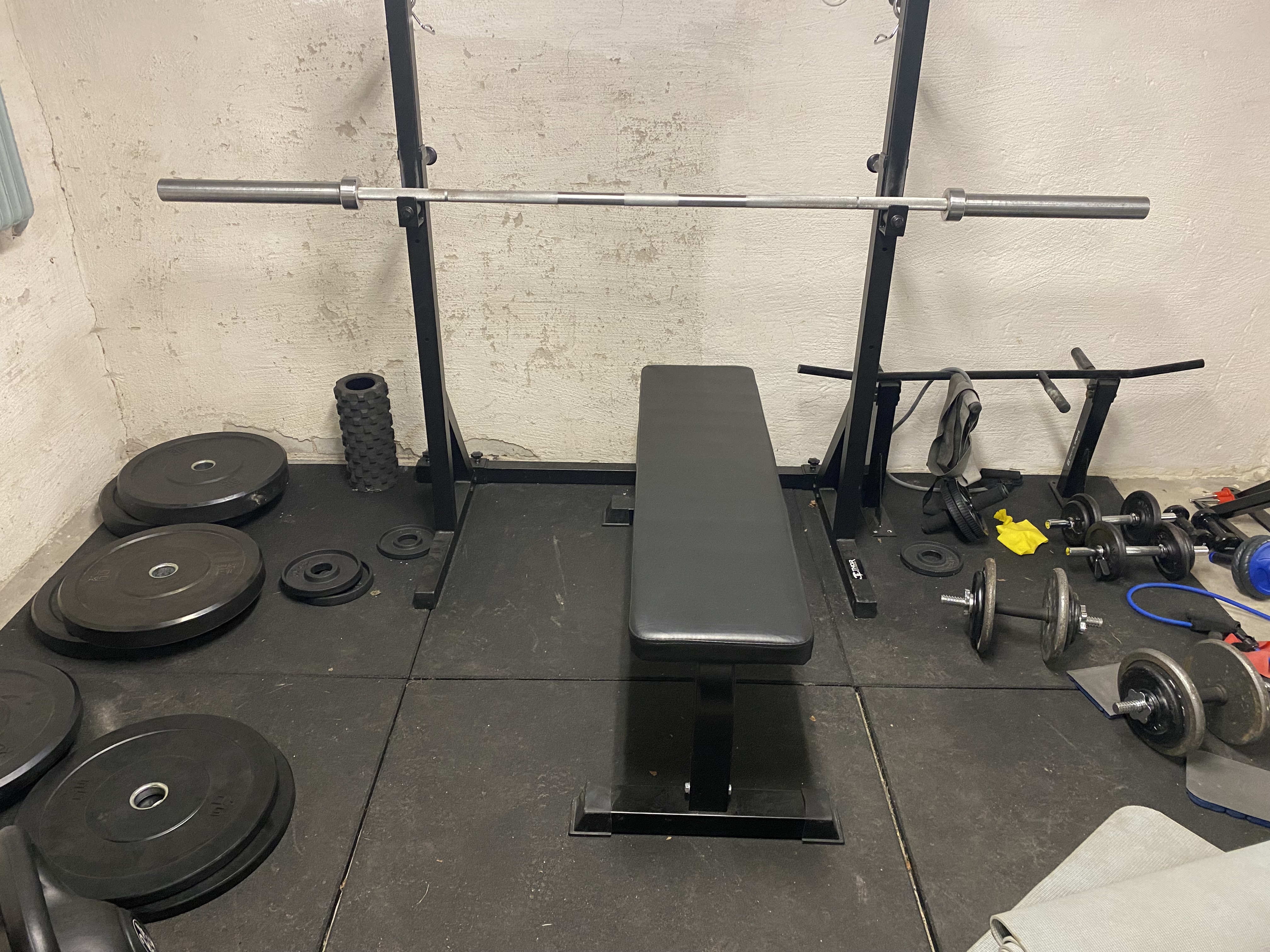 Snyggt! Bygger just nu upp ett liknande hemmagym själv. Tycker du ytan är tillräcklig för ditt behov? Jag antar att du måste flytta på bänken om du vill växla mellan bänkpress och markyft?