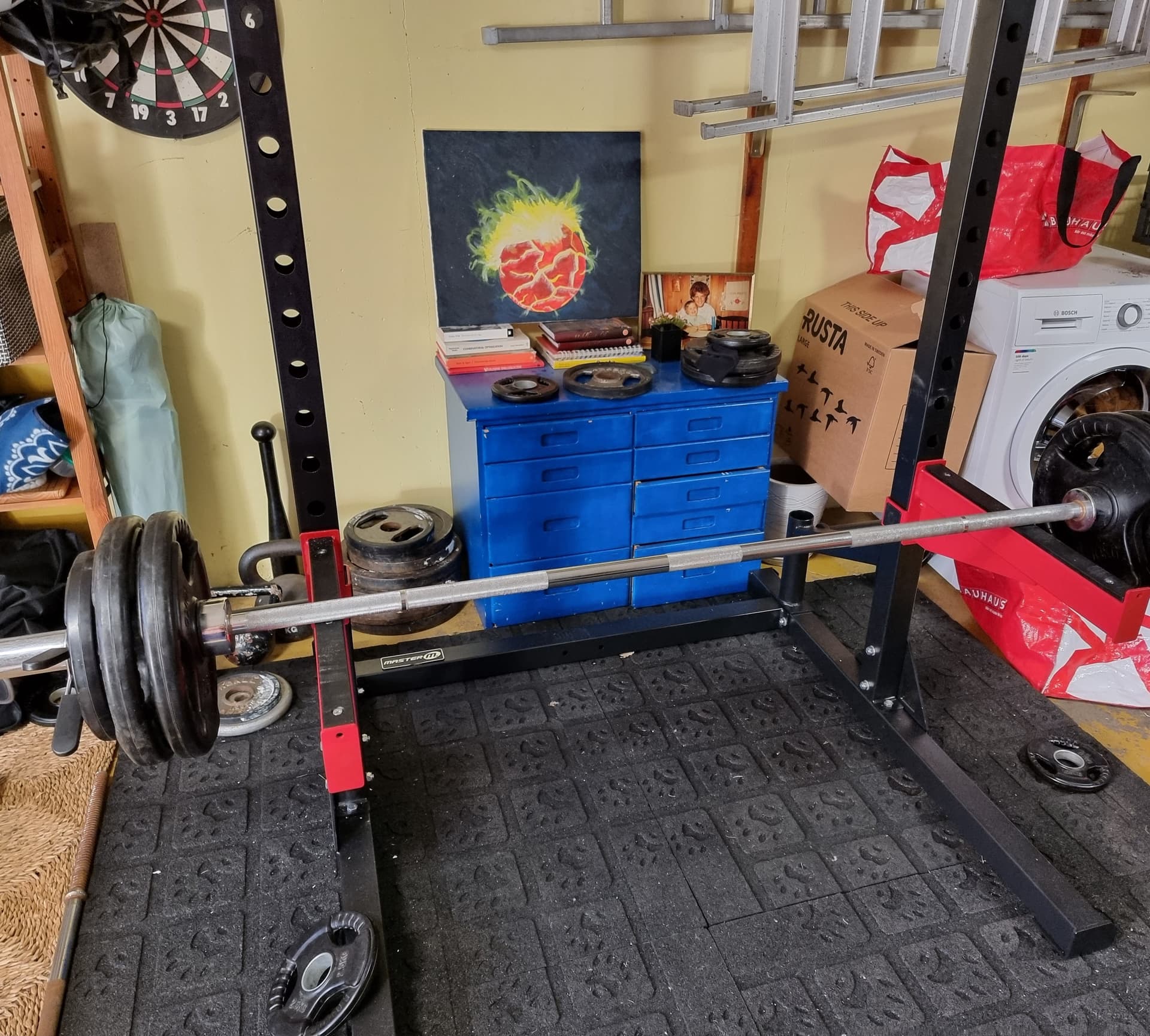 Inte jättemycket plats så jag har bara skivstång och halfrack + en bänk som inte syns