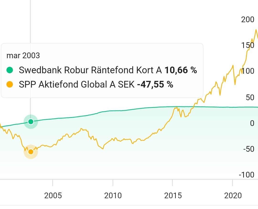 Som anekdot kan jag berätta att jag tog alla besparingar från mitt första sommarjobb 1999 och satte i en fond. När det gick ner vågade jag inte köpa något mer och efter något år tröttnade jag och sålde allt till 50 % förlust. Sen höll jag mig borta från börsen i ca 15 år.