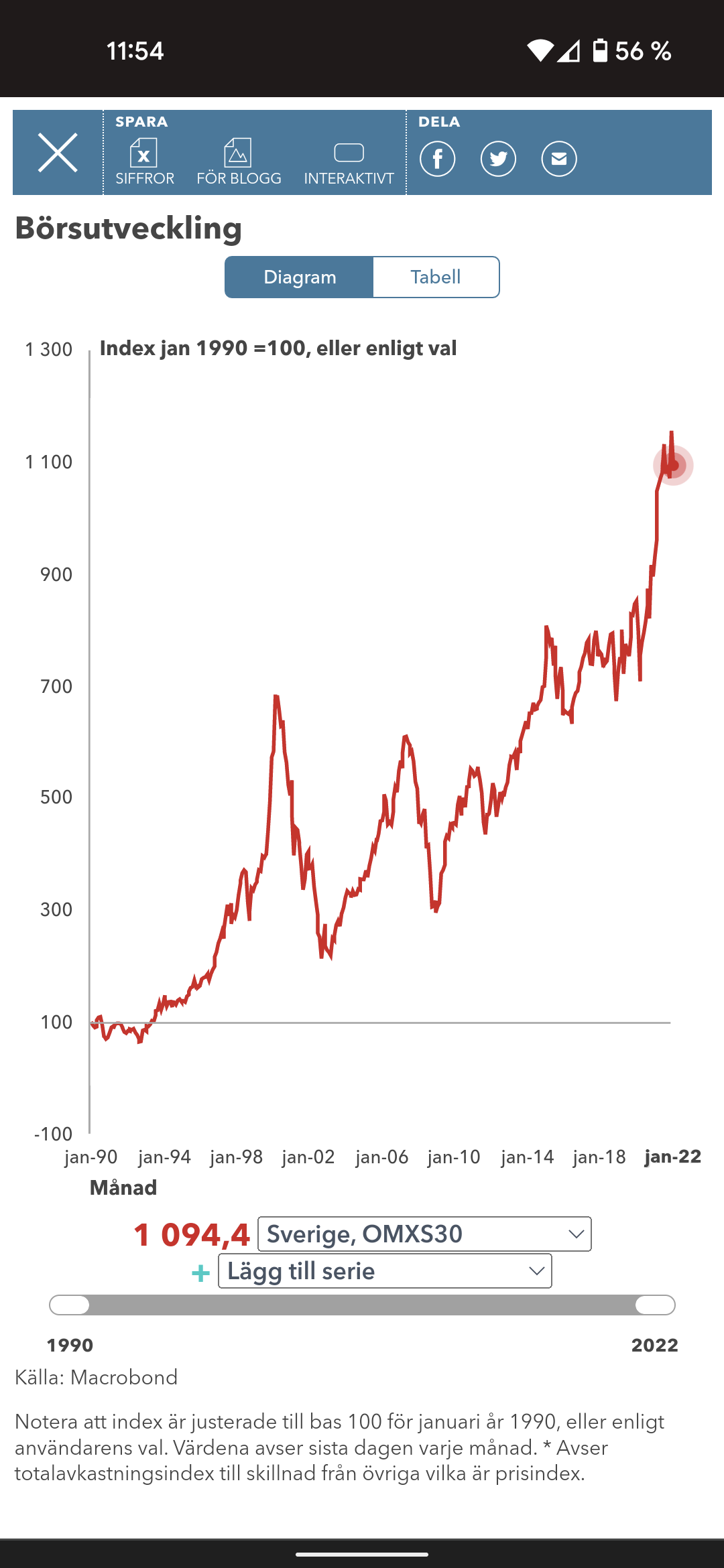 Kurvan nedan visar OMXS30 över lång tid, senaste 30 åren med andra ord.