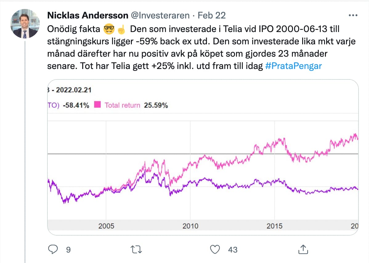 “Ex utd” är ju pinsamt dåligt av Nicklas. Det är helt irrelevant. Det är bara “Total return” som räknas. Det tog 10 år att tjäna tillbaka IPO-pengarna i Telia. Riktigt kass såklart men så kan det gå när man köper till säljarens värdering…