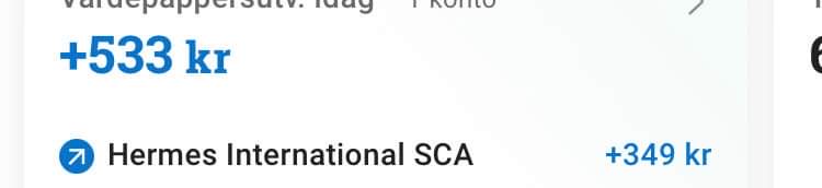 På bild 1 har jag idag tjänst 349 kronor på mina Hermès aktier men på bild 2 på mitt totala innehav för Hermès har jag tjänat + 0,08% och 18 kronor inte 349. Är det bäst att vänta tills det totala innehavet har ökat och bortse från de 349 kronorna idag?