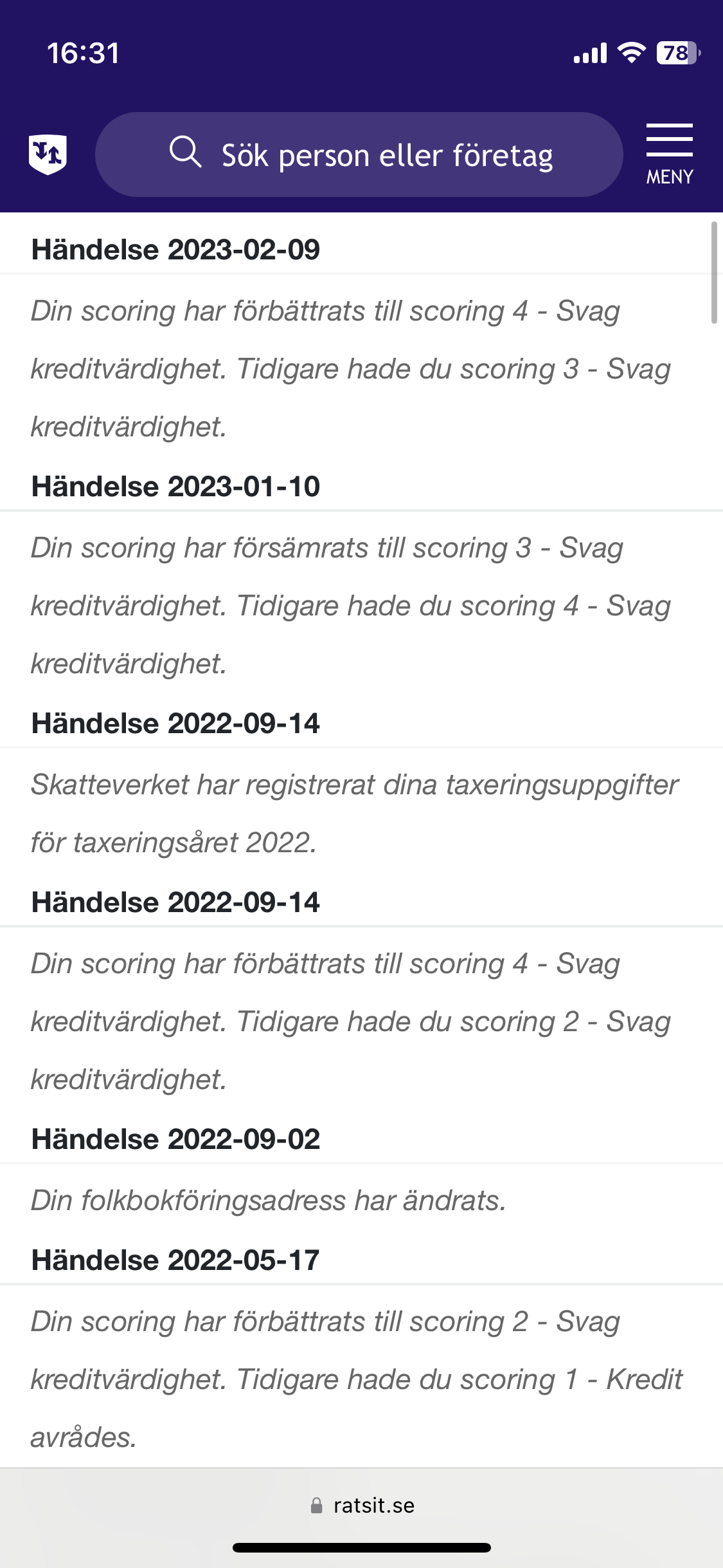 Som ni ser har jag konstig Rating hos Ratsit. Verkar gå upp och ner lite som den vill.