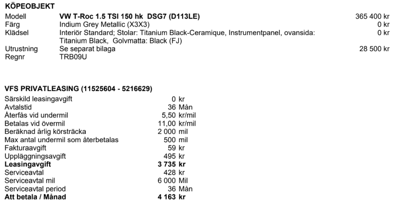 Kanske betydligt mer än man initialt tänkt sig när man eventuellt ser ett annonserat privatleasingpris på Blocket på 2695kr/mån för en VW T-Roc och tänker att det låter ju inte så mycket för en ny bil!