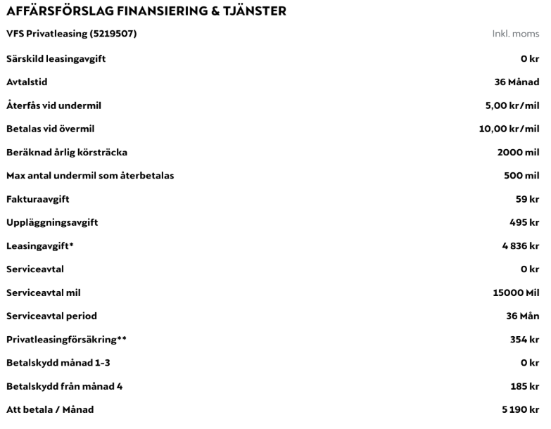 Så förutsatt att du fått med vinterdäck i offerten så hamnar du totalt på 4163+250+608+2167+14+59+240 = Ca 7500kr/mån i slutändan. Förutsatt att räntan är konstant, att du inte får några onormala skador att betala, eller behöver kosta på nya däck när bilen lämnas igen.