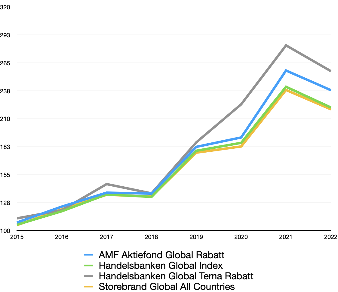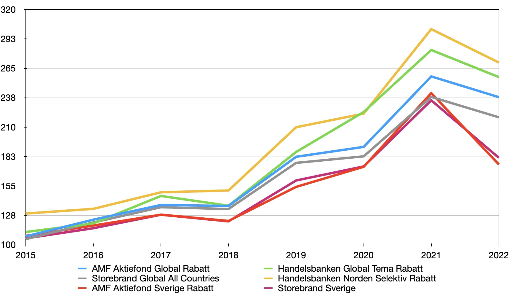 | AMF Aktiefond Global Rabatt | 108 | 124 | 137 | 136 | 182 | 192 | 257 | 238 |