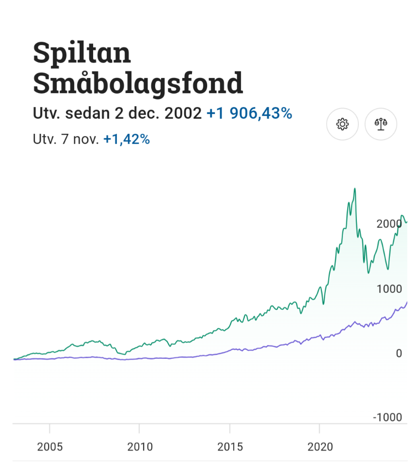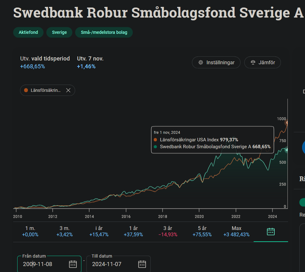 Kan man välja en Sverigefond baserat på historisk data så kan man ju välja en USA-fond baserat på historisk data. Det finns vissa enskilda år då den svenska småbolagsfonden har gått bättre men på lång sikt och överlag så har USA-fonden gått bättre. Båda dessa fonder handlas i SEK så kurvorna går att jämföra med varandra.
