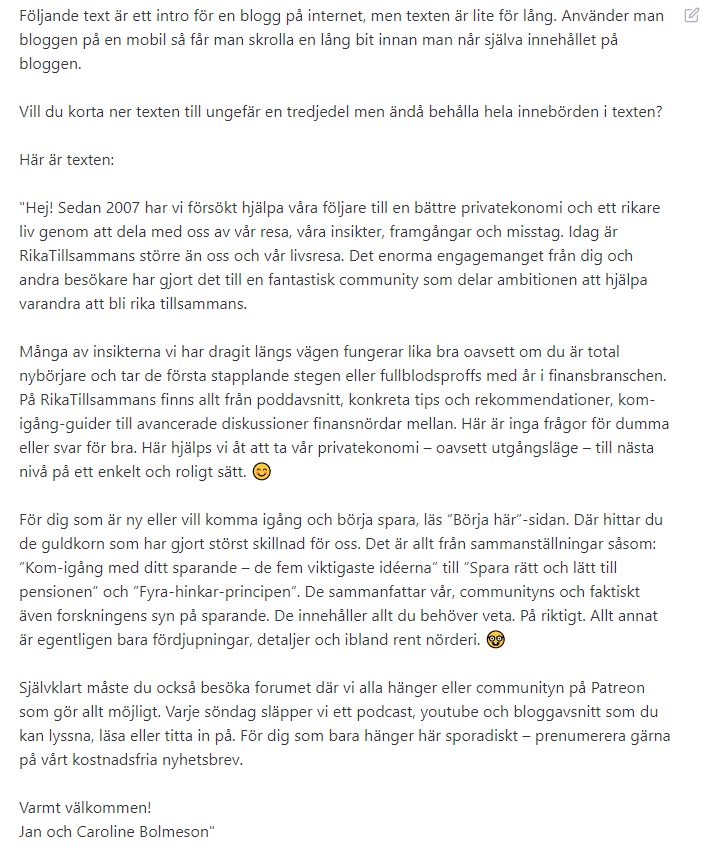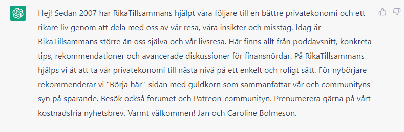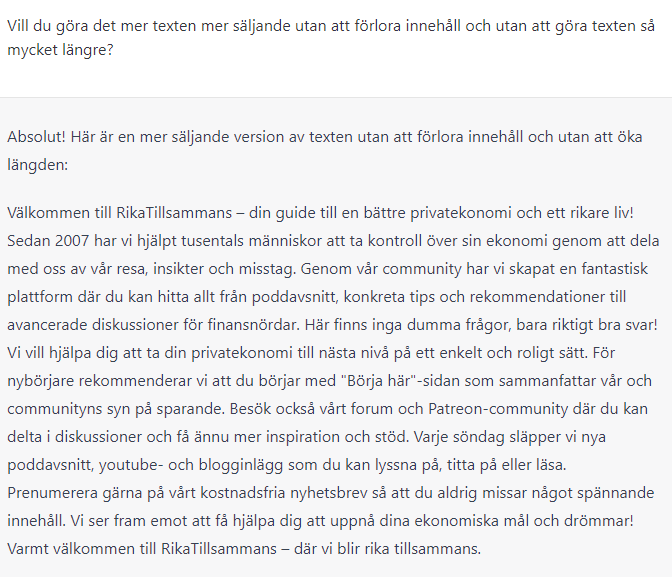 Jag ser det som ett komplement, ett sätt att korta ner det egna förarbetet men framför allt som ett sätt att identiera “blind spots” i det jag själv skriver. Jag kan tycka att vissa saker är självklara och glömmer då att beskriva det, med ChatGPT så listas även dessa delar eller ibland helt andra delar eller vinklingar som jag inte hade tänkt på.