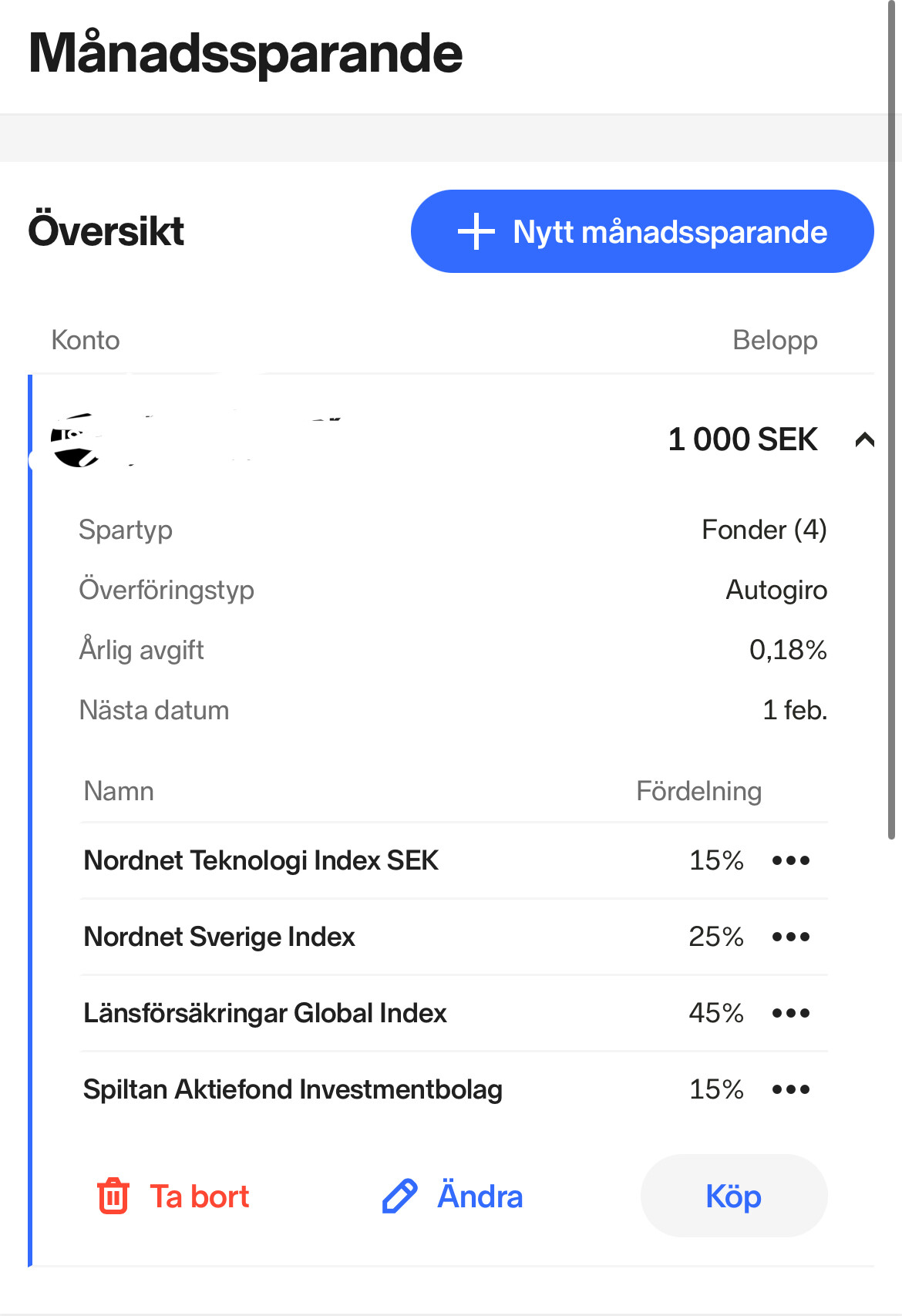 Alternativt kan du köra fondrobot som Lysa där du får fler innehav dock 20% home-bias och högre avgift men mindre att hålla koll på då du slipper köpa enstaka fonder. Eller Opti som även har fler innehav men ännu högre avgift.