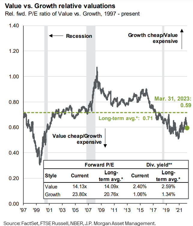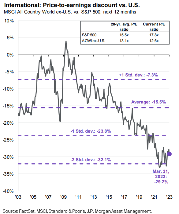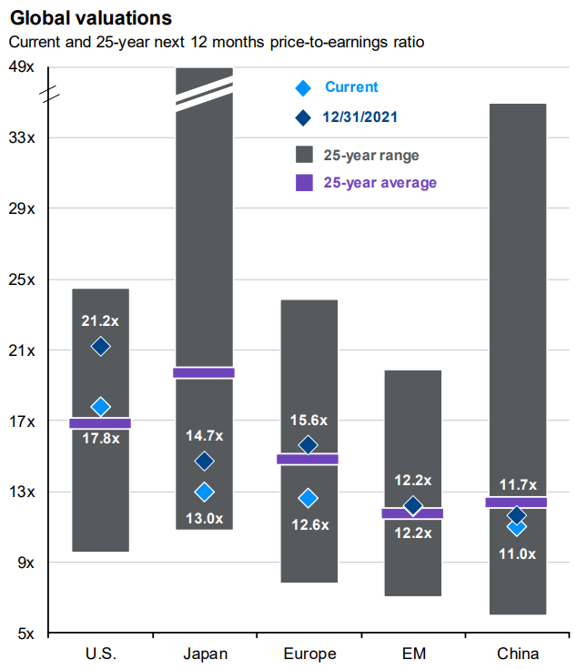 Relative valuations to recent history.JP Morgan has a chart that looks at valuations on the U.S. stock market using a bunch of different measures — earnings, CAPE, dividend yield, price-to-book, price-to-cash flow and the spread between the earnings yield and corporate bonds: