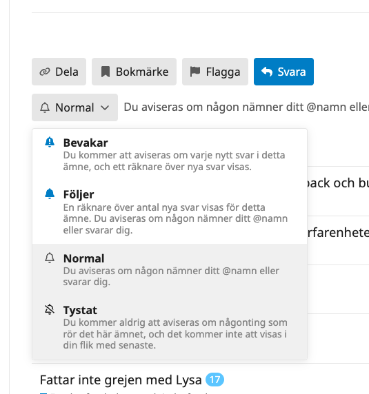 Om du väljer ”normal” där så ser du inte längre tråden i ”olästa”-fliken, vilket räcker om man förstår att använda ”nya” och ”olästa” i stället för ”senaste”. Detta rekommenderas för de som läser mycket, för då får man bara de trådar man vill ha i sin lista (”olästa”-fliken).