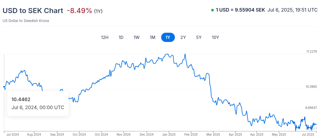 Ett år sedan: $2391,37 * 10,4462 SEK / USD = 24 980,8 SEK = Samma pris som om du köpte direkt i SEK