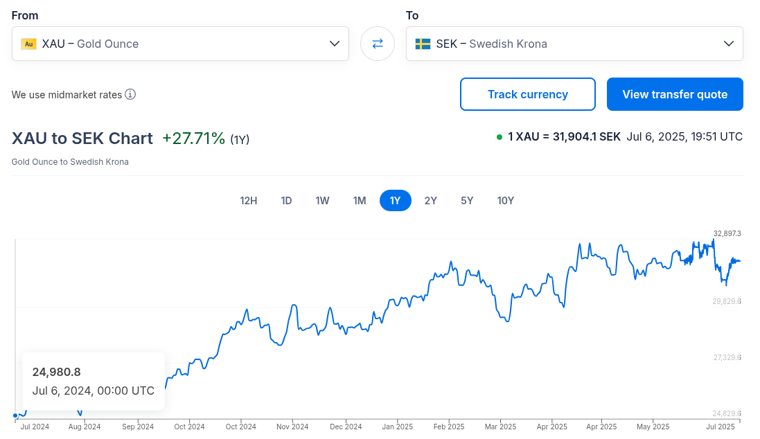 Vi köpte guld för ett år sedan för 24 980,8 SEK och sålde det idag för 31 904,1 SEK = +27,7%