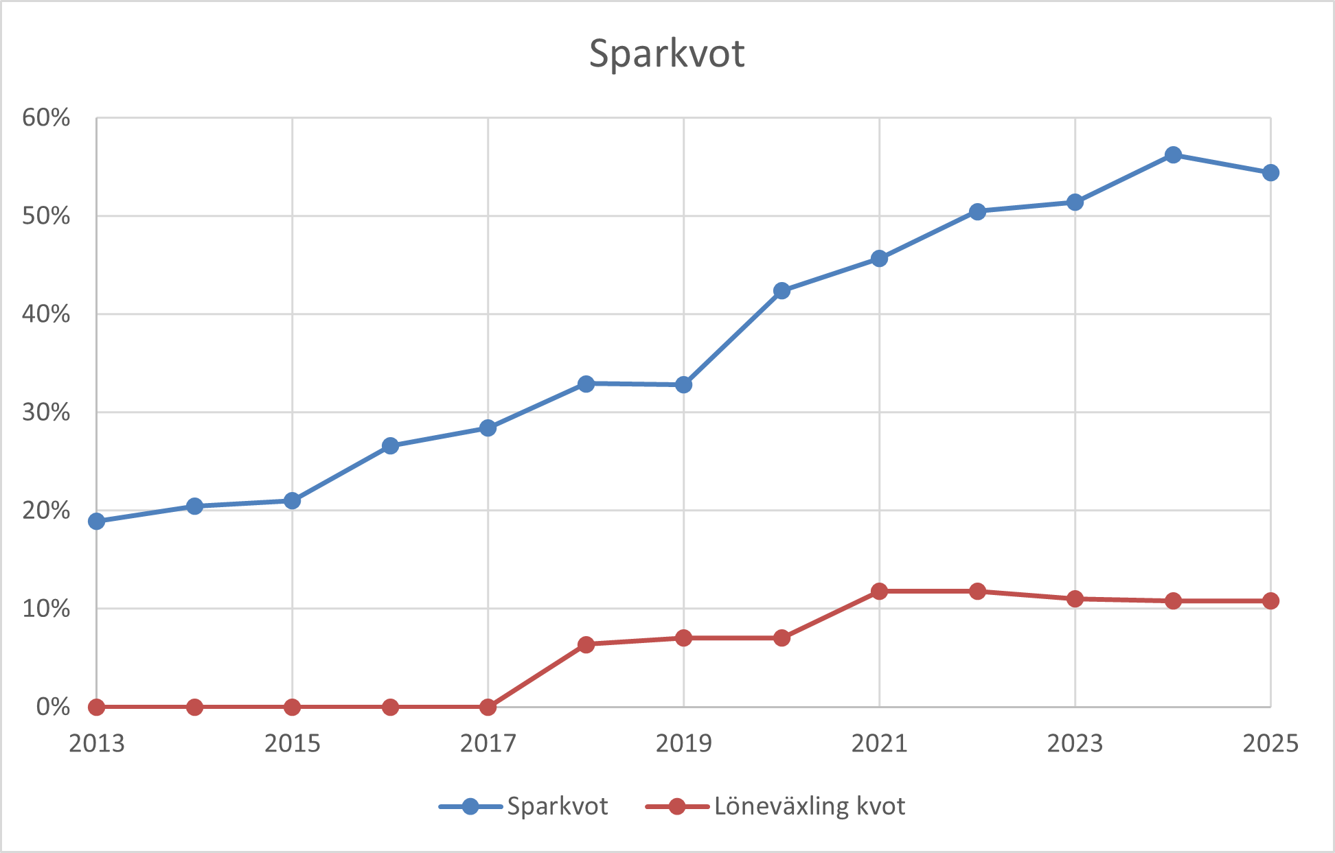 Jag kollade tillbaka lite och såg hur det såg ut för mig. Jag har bara tagit med sparande som går “automatiskt”, i mitt fall stående överföringar. Eventuella engångsbelopp är inte med. Sparkvoten är på nettolönen och löneväxlingskvoten är på bruttolönen.