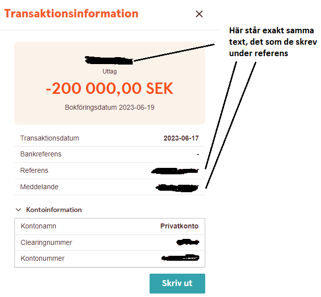 Dessutom står det exakt samma text på tre ställen, referensen de skrev in. Inte meddelande till mottagare. Kanske är det så att de har lagt upp oss som sparad betalningsmottagare eller nåt och gett oss detta namn som referens, och då syns det överallt, vet inte… oavsett vilket syns inte “Kalle Anka” någonstans…