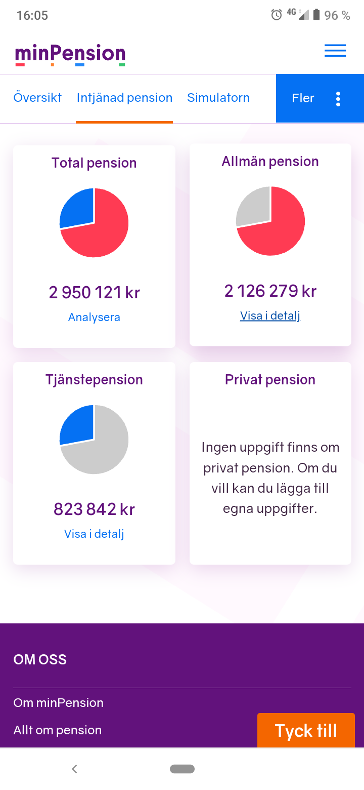 Kikade på min svärfars (59år) allmän pension tidigare iår och då hade han samlat värde på ca 3,6M i allmän pension (inkomstpension & premiepension ihop)