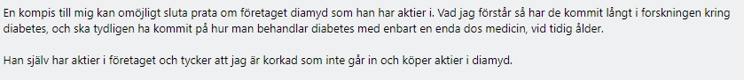 Villiga att lita blint på en person utan att veta om jag 1. Ens har fog för att säga att jag är en bra investerare .De har inte sett att jag att jag en gång för miljarder år sedan köpte SAS-aktier som minskade 80% i värde. Att jag köpte PEAB-aktier för att någon sa till mig att man skulle satsa på byggaktier när det fanns byggkranar i skyn (insåg först efteråt att det stod Skanska på de där byggkranarna). 2. Inte har alternativa motiv för att rekomendera aktie X, att jag inte ens FÅR rekomendera något utan risk för att vara kurspåverkande.