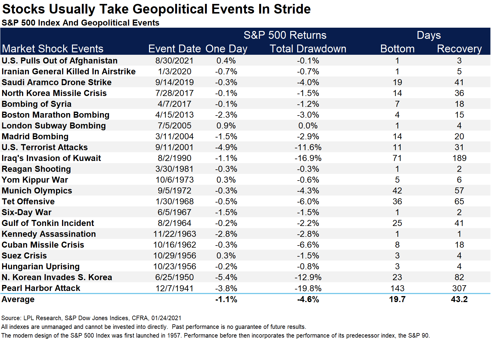 Det behöver inte bli så dramatiskt på finansmarknaderna då det som tidigare nämnt antagligen är rätt inprisat vid det här laget. Hittade följande bild i Twitter-flödet på hur amerikanska S&P 500 reagerat vid olika geopolitiska händelser.