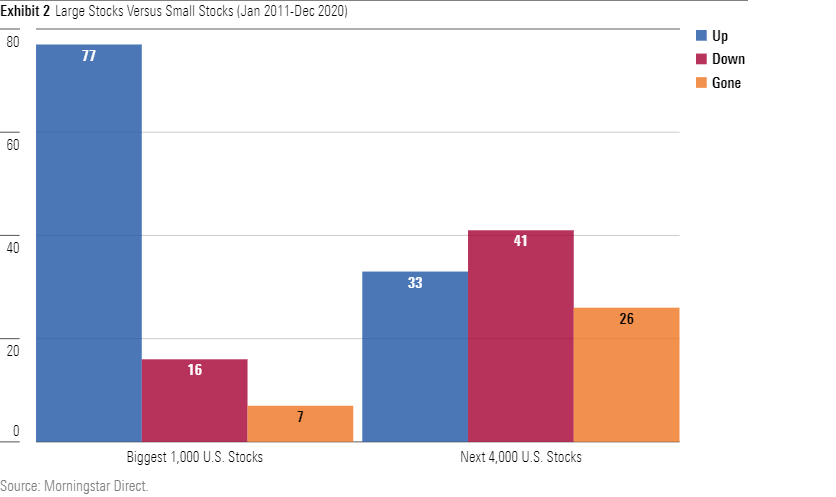 The larger companies were far more reliable than their smaller rivals. Whereas 42% of the overall stock universe persisted for the full decade and posted a positive total return, 77% of the biggest 1,000 companies did so. Conversely, once the larger fish had been removed from the list, the success ratio of the next 4,000 stocks dropped to just 33%. Even though the decade contained a prolonged bull market, most smaller stocks recorded a loss, not a gain.
