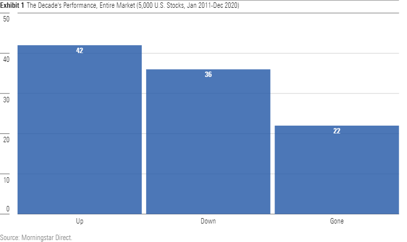 The numbers clearly support Bessembinder’s argument. Although the Morningstar U.S. Stock Index enjoyed a 13.90% annualized gain for the decade, only 42% of individual equities finished in the black. Nearly as many (36%) posted 10-year losses. The final 22% vanished. While I did not investigate the fates of the dead, Bessembinder’s research suggests that half the expired stocks were acquired, with decent results, while the other half were delisted, with dire consequences. Even during a decade marked by an almost uninterrupted bull market, the average stock wasn’t much good.