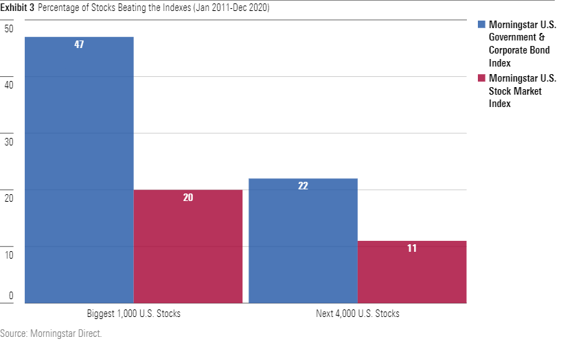 Once again, the disparity between the size groups is apparent. A randomly chosen company from the biggest 1,000 list was more than twice as likely to survive the period and surpass the bond index than was a stock picked from the next 4,000. The precept that most stocks disappoint applied much more to secondary stocks than to larger organizations.