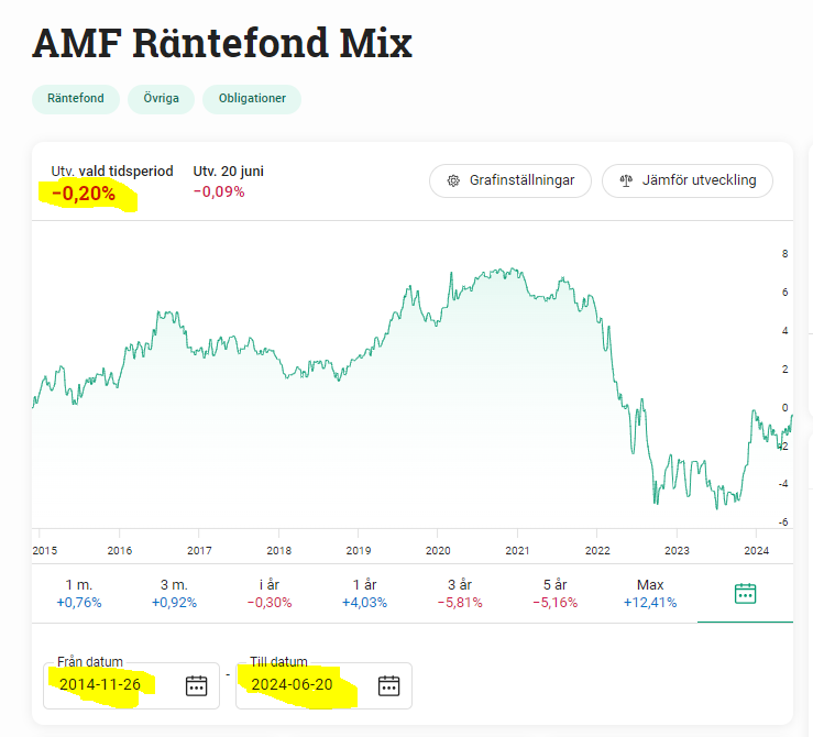 Sen för de som är intresserad av räntefonder. Så kan man alltid hitta perioder som är ”dåliga”. Därför bra att månadsspara och sprida ut risken. En lång räntefond har inte haft det lätt senaste åren. Den dippen lär justeras med de kommande årens räntesänkning. Detta är inte unikt för AMF Mix.