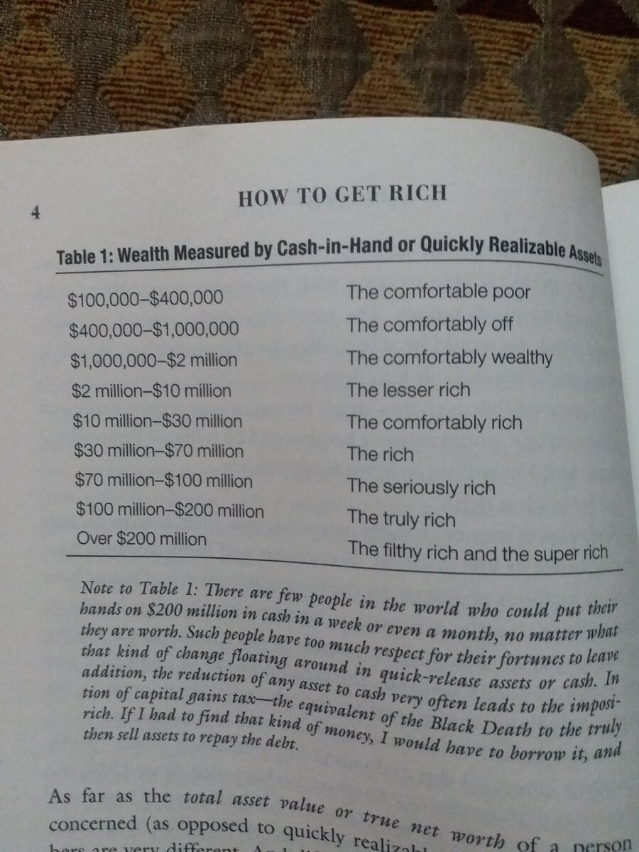 För min egen del är det viktigt att ta med variabler i rikedom som är utanför det som jag absolut behöver. Om min vän ska gifta sig i Costa Rica kan jag flyga dit utan att jag behöver göra avkall på någonting annat o.s.v. Den typen av rikedom som jag har som mål är ej att kunna köpa varje ny Aston Martin, men den är att kunna ta mig var jag vill i världen och bo hotell av god kvalitet i fem dagar utan att det har någon inverkan på mitt liv. Det är ju sanslös lyx egentligen, men inte helt bortom alla proportioner ivf.