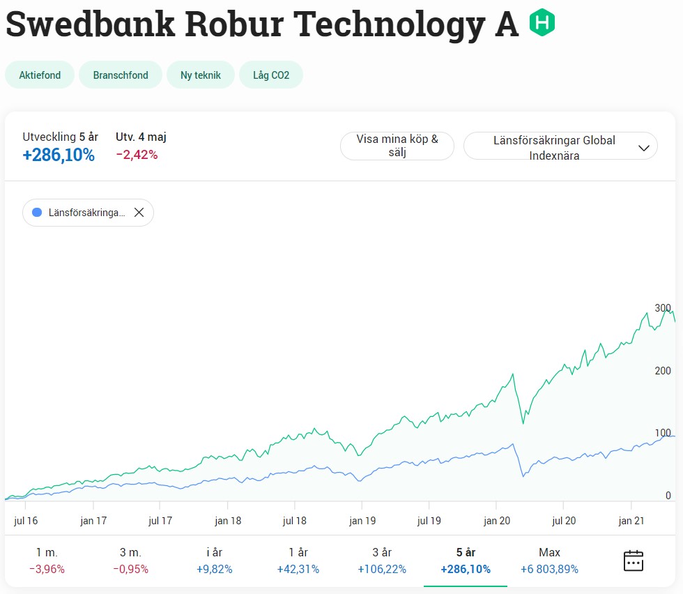 Swedbank Robur Technology A jämfört med den blå linjen Länsförsäkringar global indexnära över en femårsperiod. Till syntes stor skillnad.