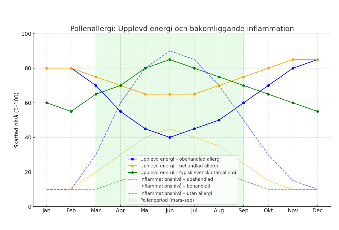 Obs: Grafen är en illustration av upplevd energinivå vid allergi, inte exakta mätdata. Den bygger på kända samband i forskningen: obehandlad allergi ger energidippar under pollensäsong och lång restinflammation, behandling jämnar ut kurvan, medan icke-allergiker följer en mer normal årscykel. Se t.ex. ARIA Guidelines, Ciprandi et al. 2004, Durham & Scadding 2001, Blaiss et al. 2018, Walker et al. 2007, Läkemedelsverket, 1177.